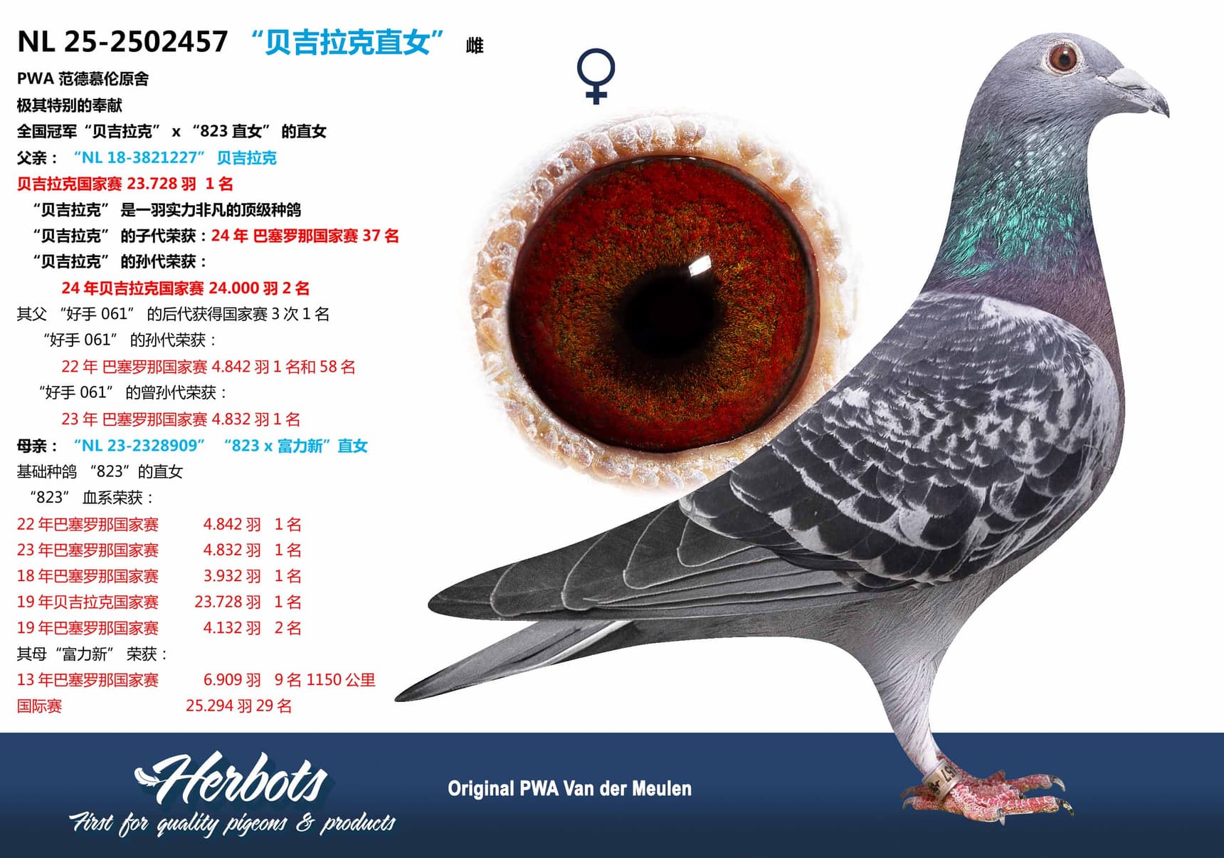 The winner himself, "Bonte 760," also won 165th National Barcelona against 4,832 pigeons in 2022. Her sire is inbred to stock sire "Superkweker 823" and is a grandson of "Crack 61." The dam of "Bonte 760" is a daughter of "116," this super breeding hen is the dam and grandmother of four 1st National winners and was often the regular partner of stock sire "Superkweker 823."