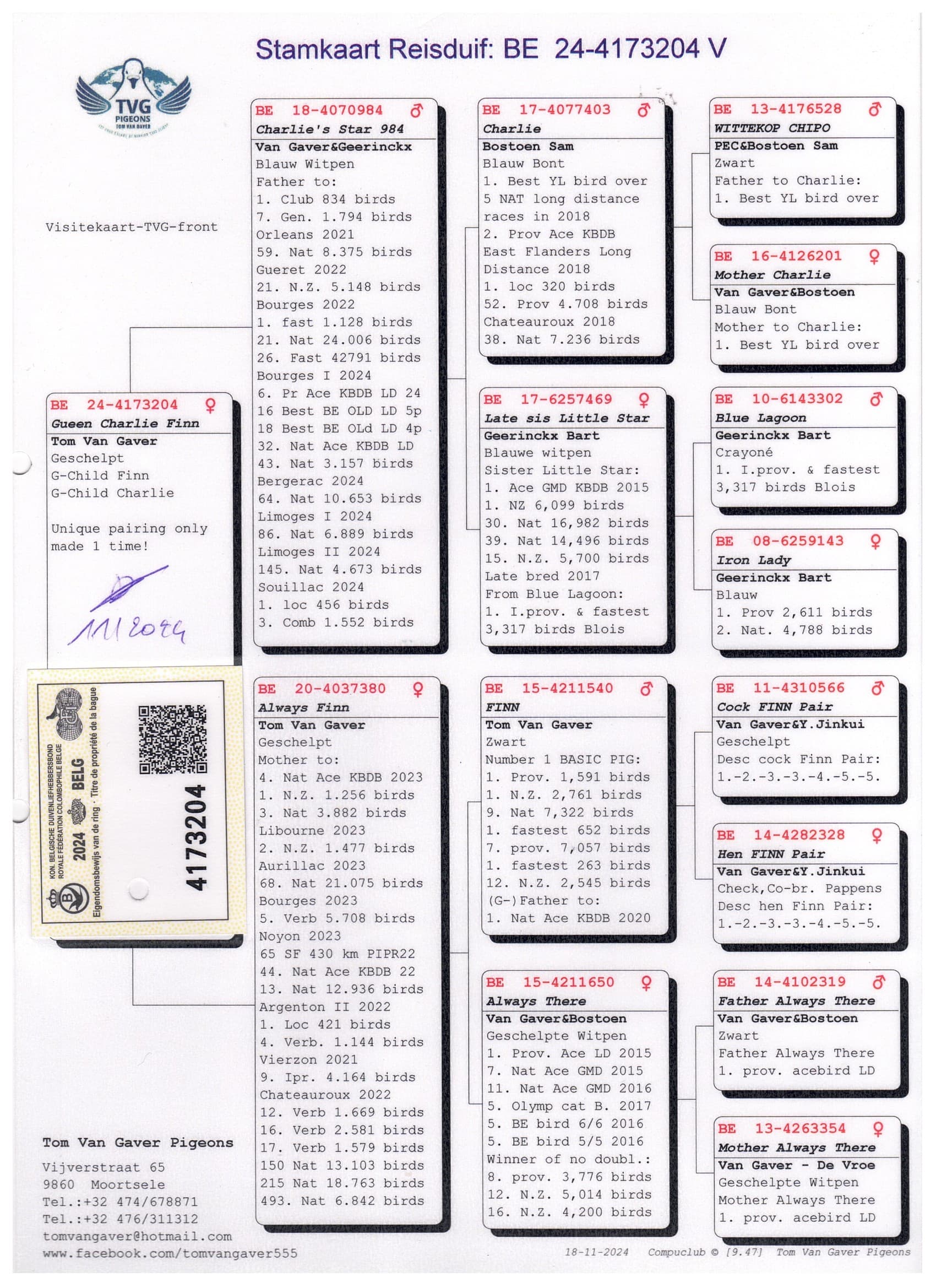 “芬尼”是1号基础鸽,荣获 : 图勒国家赛 7.322羽9名