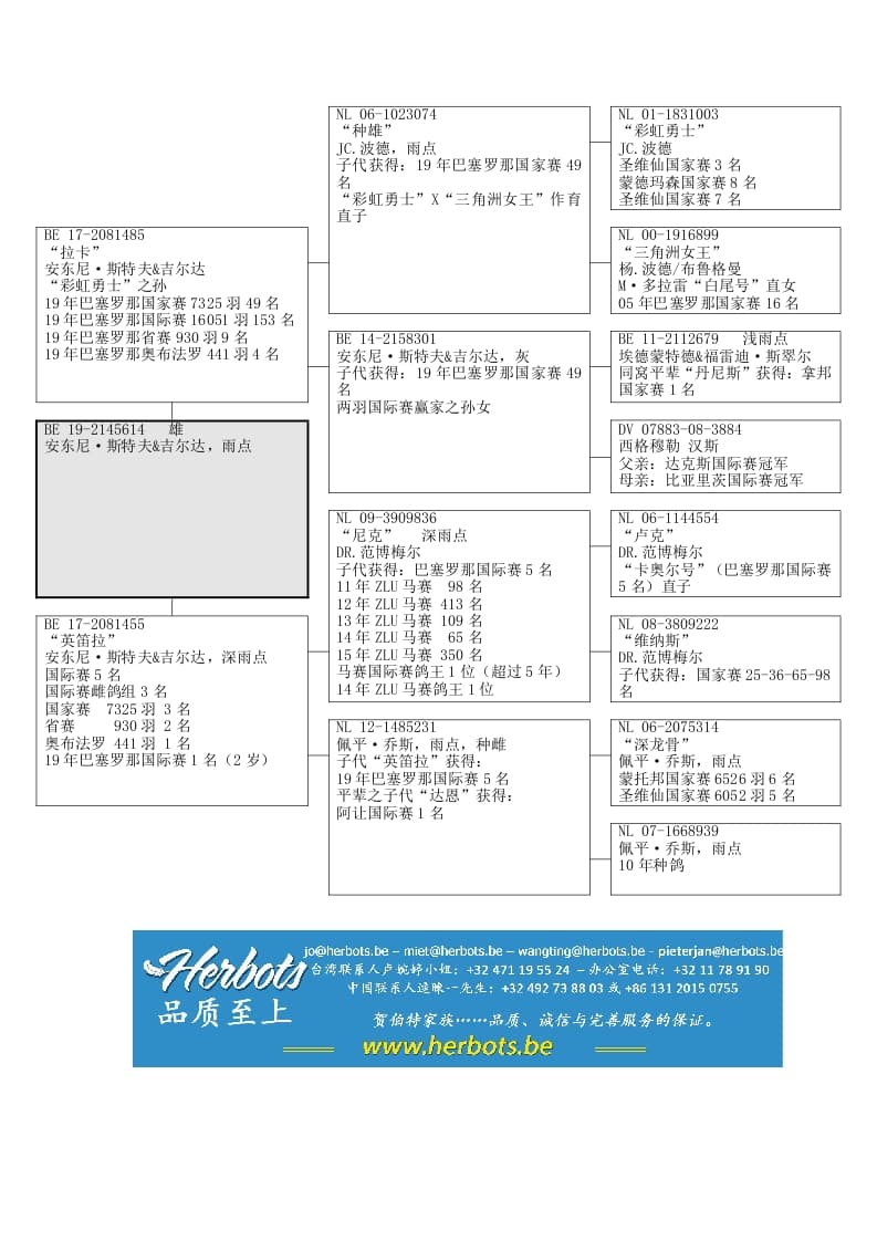 父亲:BE 17-2081485“拉卡”19年巴塞罗那国家赛1086公里7301羽49名国际赛16051羽153名母亲:BE 17-2081455“英笛拉”19年巴塞罗那国家赛1086公里7301羽3名国际赛16051羽5名