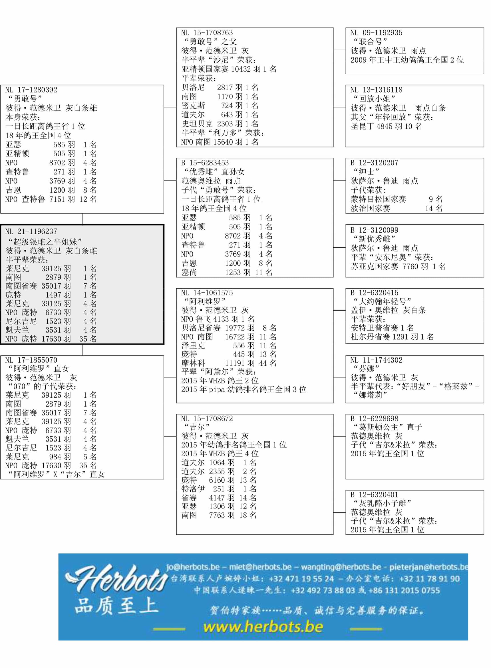 荣获: 18年一日长距离鸽王省1位/全国4位 - 亚瑟 585羽1名 – 亚精顿国家赛 8,702羽4名 – NPO查特鲁 3,769羽4名 – 查特鲁国家赛 7,151羽12名