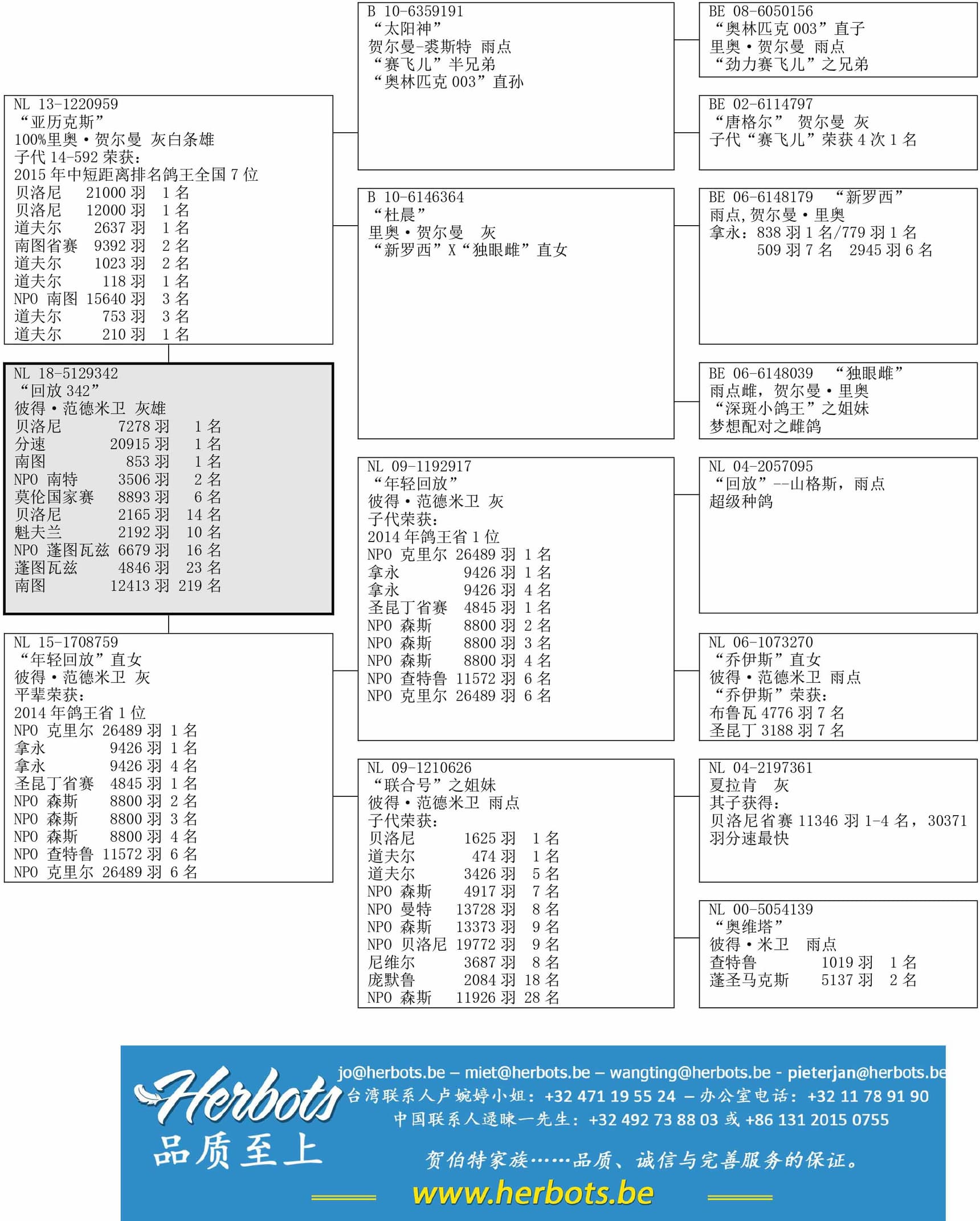 平辈荣获: 14年鸽王省1位 – NPO克里尔 26,489羽1名 – 拿永 9,426羽1名和4名 - 圣昆丁省赛 4,845羽1名 – NPO 森斯 8,800羽2名、3名和4名 – NPO 查特鲁 11,572羽6名- NPO 克里尔 26,489羽6名