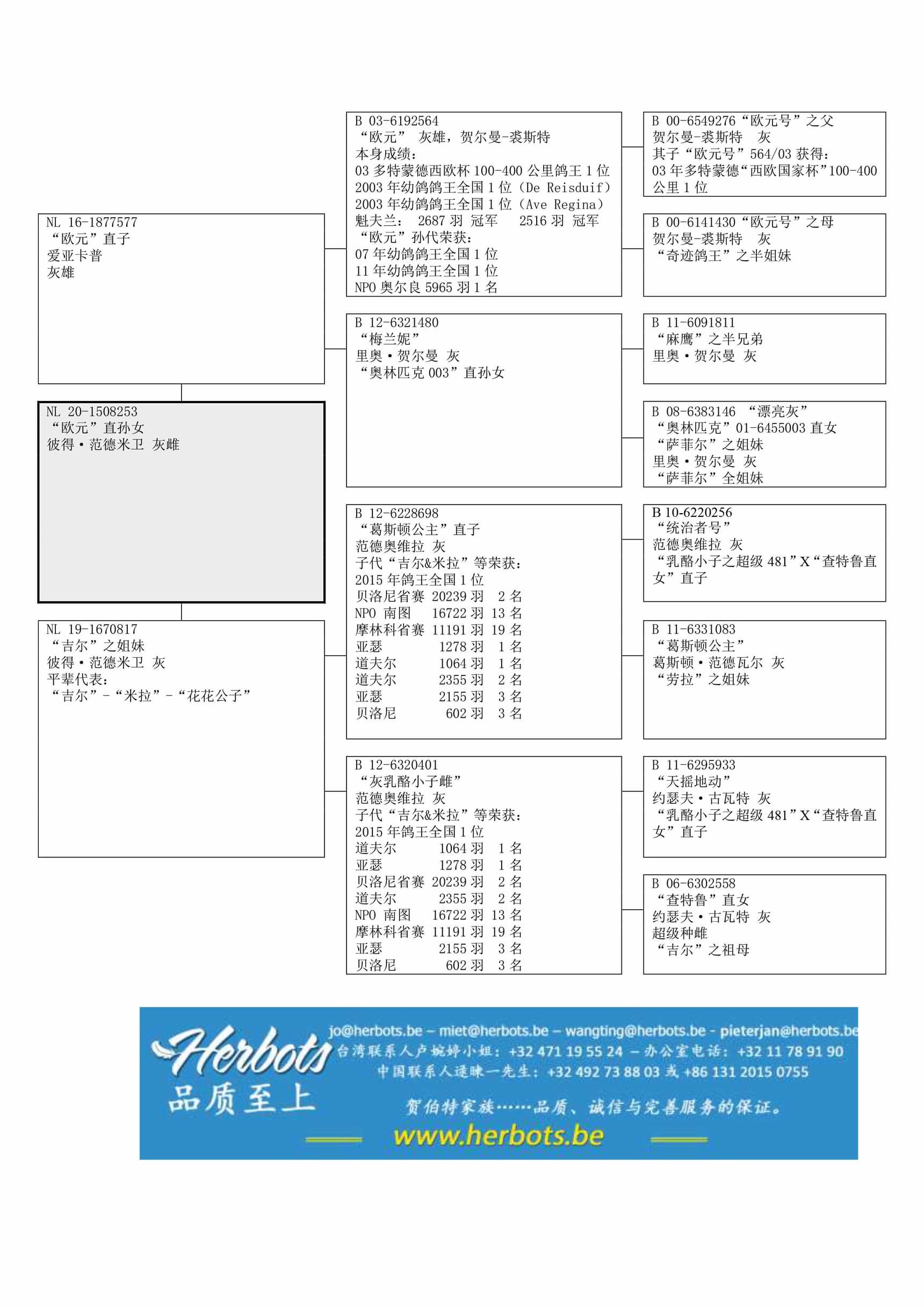 后代荣获: 15年德国奥林匹克鸽王1位 -13年加拿大短距离鸽王全国1位