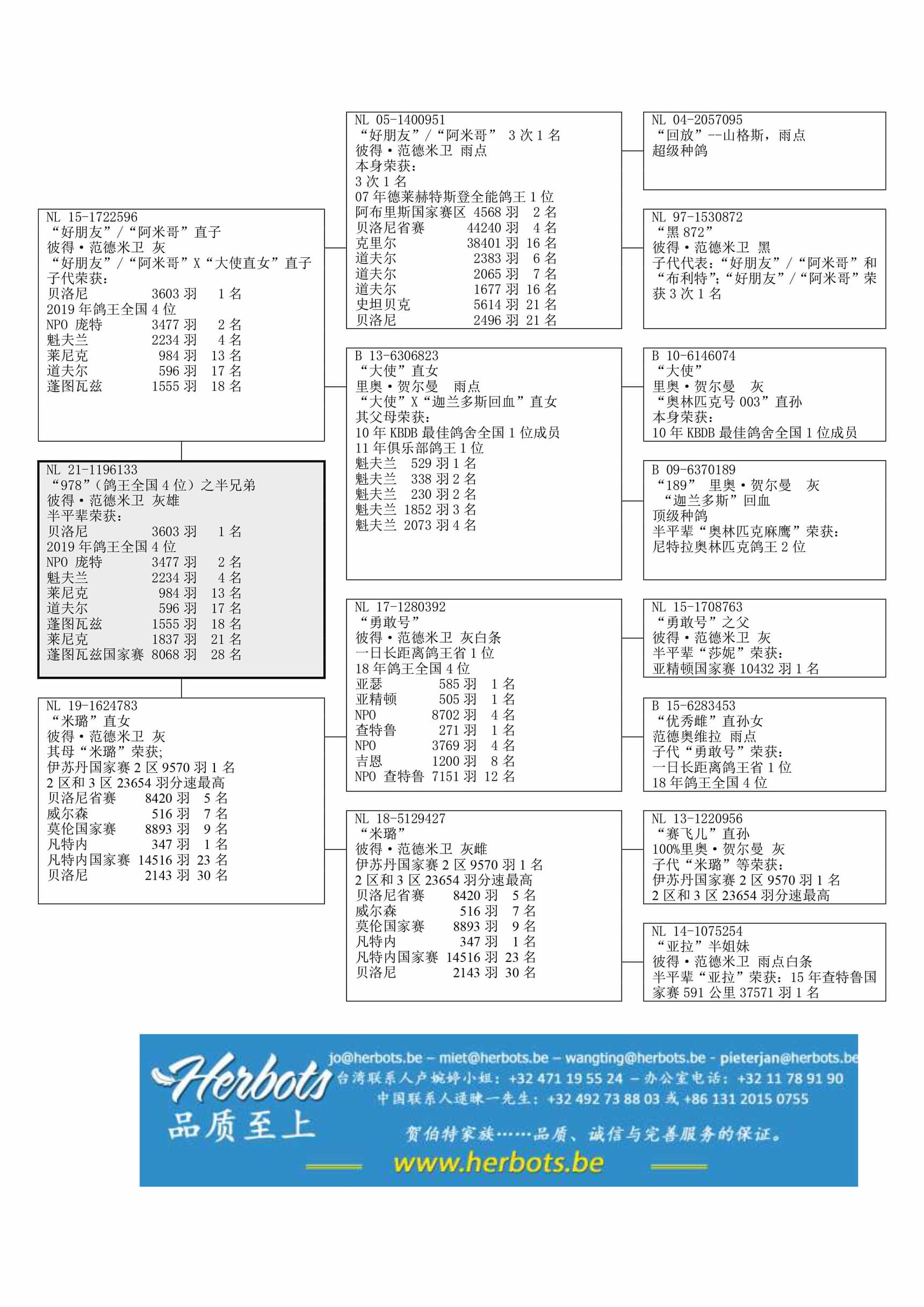 鸽王全国4位– 贝洛尼 3,603羽1名 – NPO庞特 3,477羽2名 – 魁夫兰 2,234羽4名 – 蓬图瓦兹国家赛 8,068羽28名