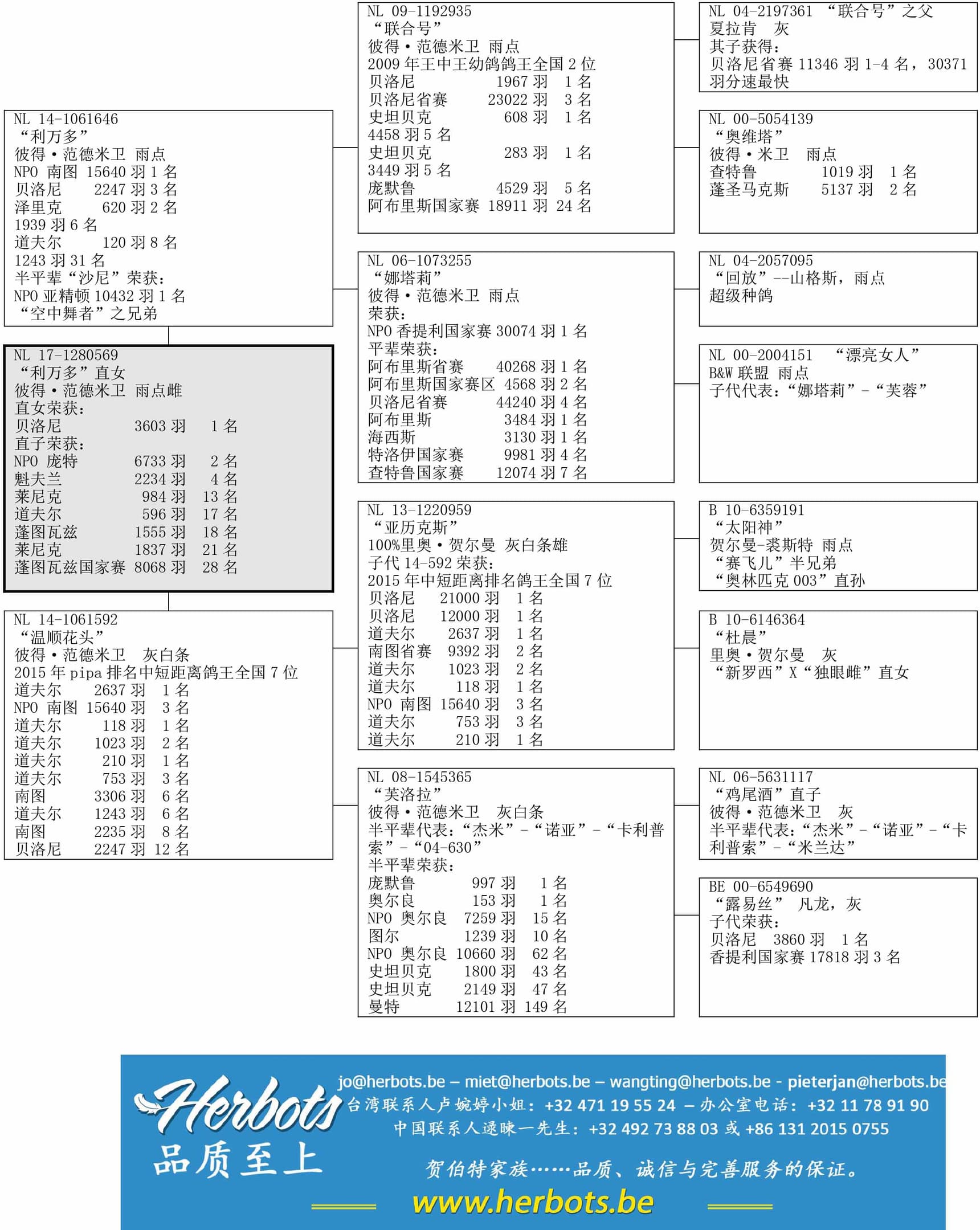 2019年鸽王全国4位 - NPO 庞特 6,711羽2名 (同舍鸽之后)  - 魁夫兰 2,234羽4名 – 莱尼克 984羽13名 - 道夫尔 596羽17名 - 蓬图瓦兹 1,555羽18名 - 莱尼克 1,837羽21名 - 蓬图瓦兹国家赛 8,068羽28名