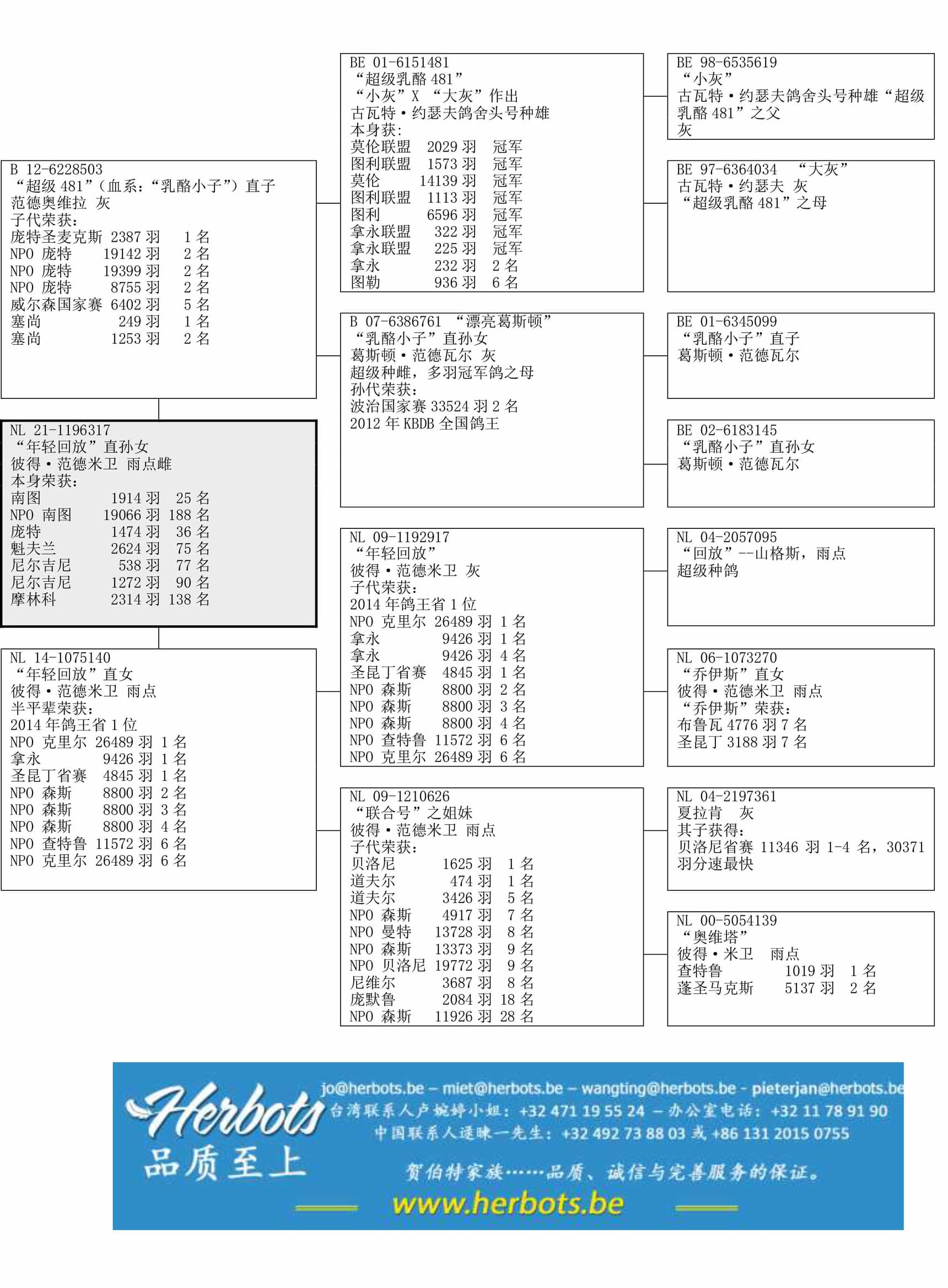 半平辈荣获: 14年鸽王省1位 – NPO 克里尔 26,489羽1名 – 拿永 9,426羽1名 和4名 - 圣昆丁省赛 4,845羽1名 – NPO 森斯8,800羽2名、3名和4名 – NPO 查特鲁 11,572羽6名 – NPO 克里尔 26,489羽6名