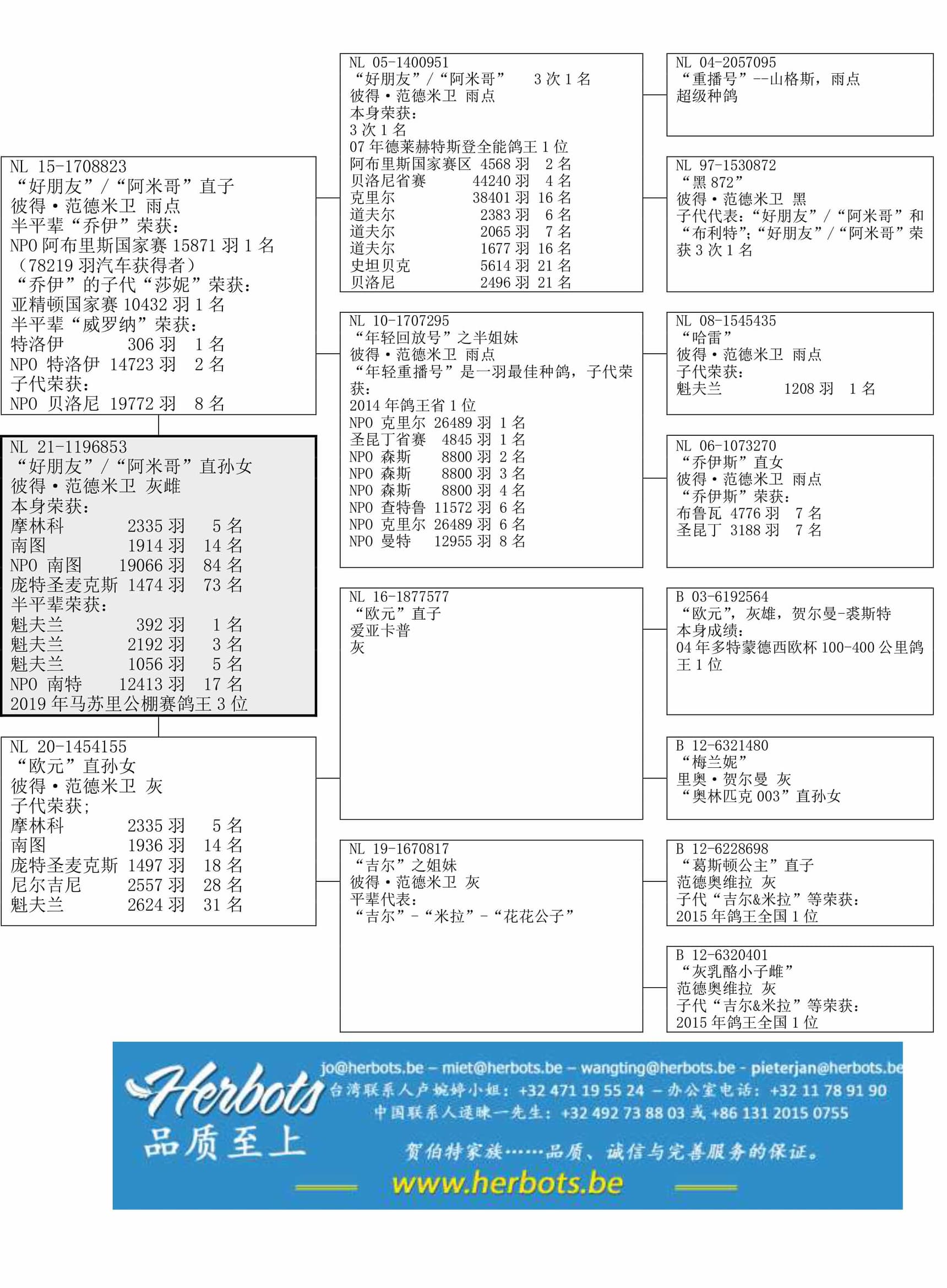 “欧元直子” (出自“欧元” B03-6192564- 贺尔曼-裘斯特 x “奥林匹克 003直孙女”) x“吉尔之姐妹” (全平辈“吉尔”荣获: 幼鸽鸽王全国1位(排名)–15年WHZB鸽王全国4位;全平辈“米拉”荣获: 2015年鸽王全国20位 – 6 次前10名 – 19,772羽13名 – 3,306羽27名 – 6,295羽28名;全平辈“吉尔之姐妹357”荣获: 31 次入赏 – 26 次前1/10 – 10 次前1/100;全平辈“吉尔之姐妹356”荣获: 27 次入赏 – 21 次前1/10 – 9 次前1/100) 作出
