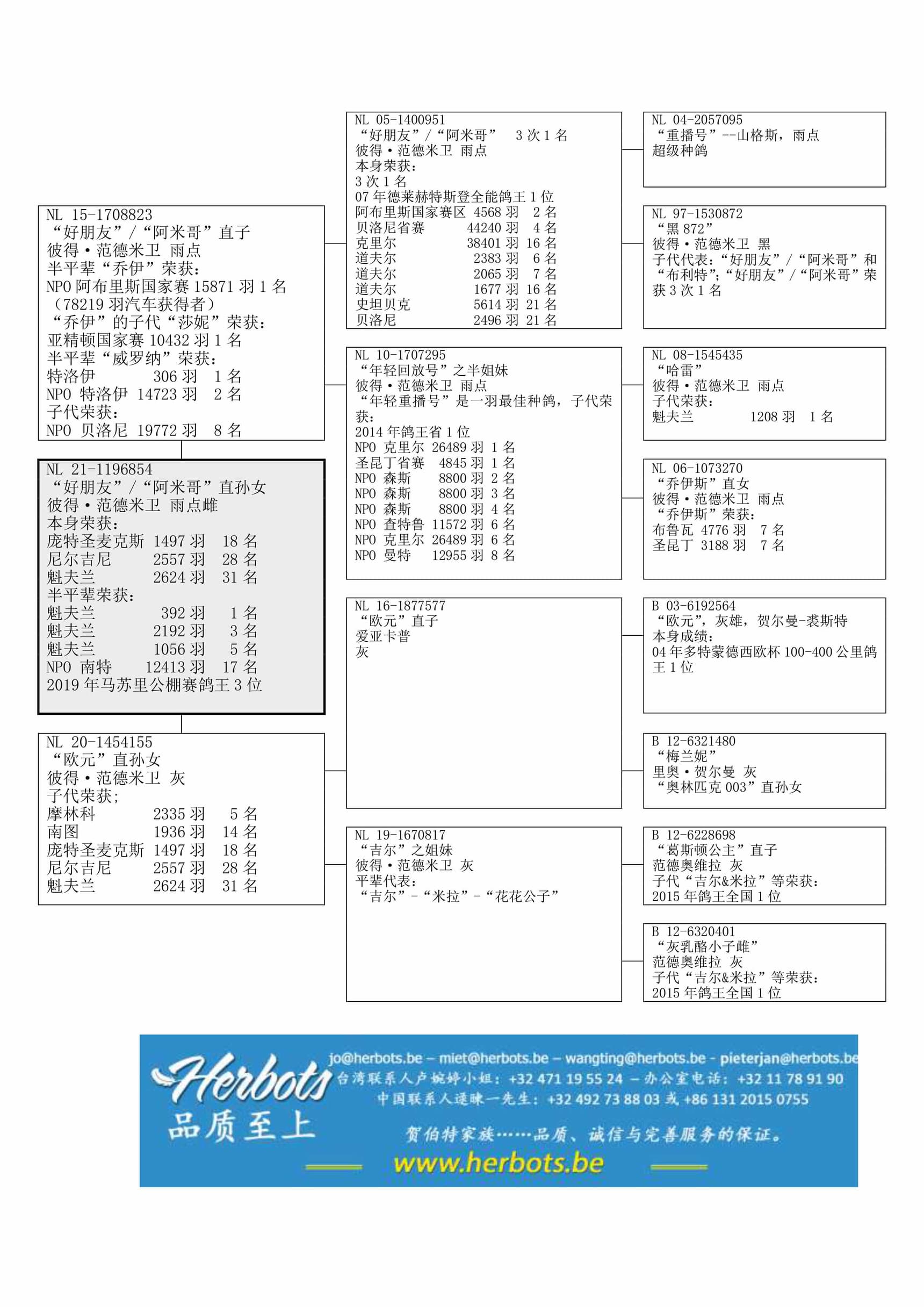 “欧元直子” (出自“欧元” B03-6192564- 贺尔曼-裘斯特 x “奥林匹克 003直孙女”) x“吉尔之姐妹” (全平辈“吉尔”荣获: 幼鸽鸽王全国1位(排名)–15年WHZB鸽王全国4位;全平辈“米拉”荣获: 2015年鸽王全国20位 – 6 次前10名 – 19,772羽13名 – 3,306羽27名 – 6,295羽28名;全平辈“吉尔之姐妹357”荣获: 31 次入赏 – 26 次前1/10 – 10 次前1/100;全平辈“吉尔之姐妹356”荣获: 27 次入赏 – 21 次前1/10 – 9 次前1/100) 作出