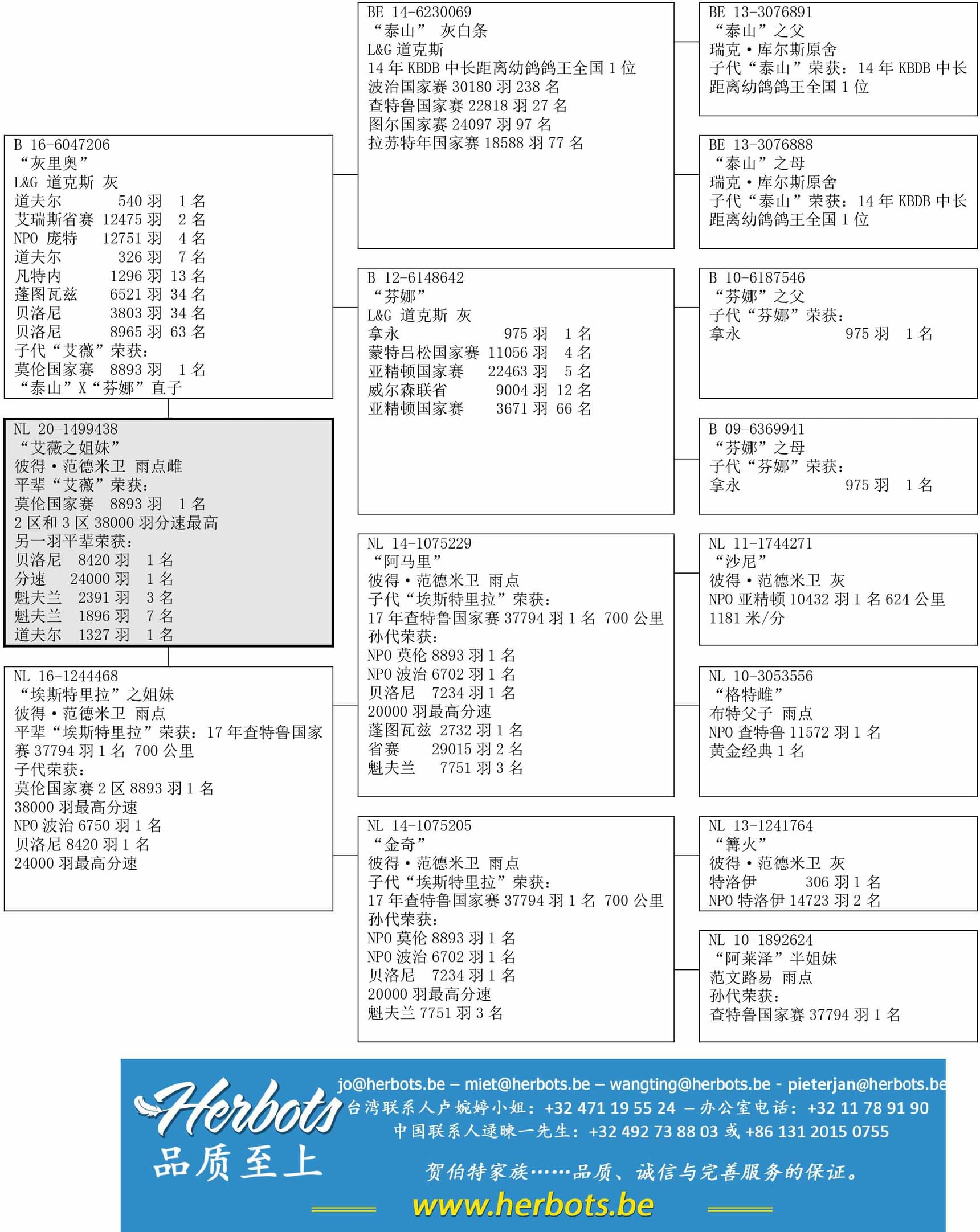 其子代代表及佳绩:“莉奥诺拉” (鸽王全国3位和5位)以及“罗密尔” (鸽王全国1位和2位)