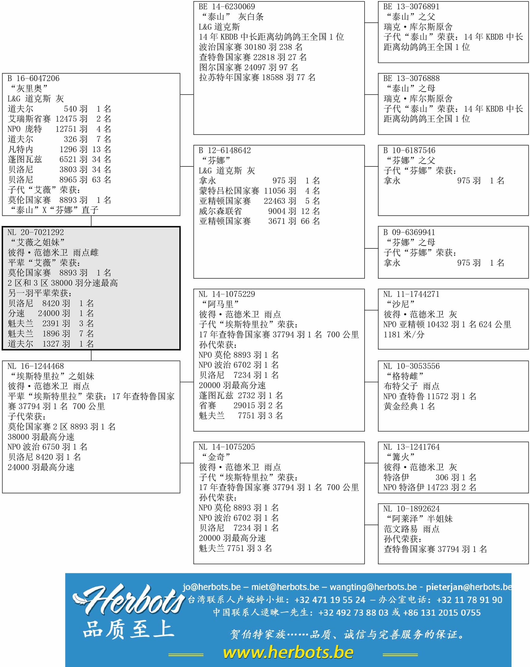 其子代代表及佳绩:“莉奥诺拉” (鸽王全国3位和5位)以及“罗密尔” (鸽王全国1位和2位)