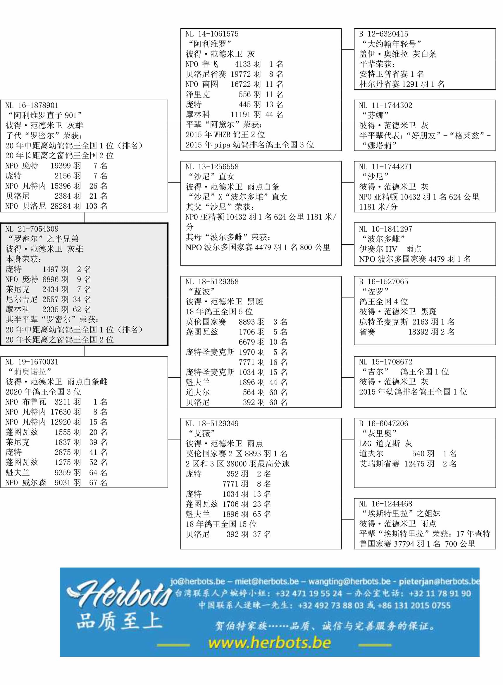基础种鸽“阿利维罗” (NPO 鲁飞 4,133羽1名 – 贝洛尼省赛 19,772羽8名 – NPO 南图 16,722羽11名) x “莎妮直女” (出自NPO 亚精顿 10,432羽1名以及NPO 波尔多 4,479羽1名) 直子
