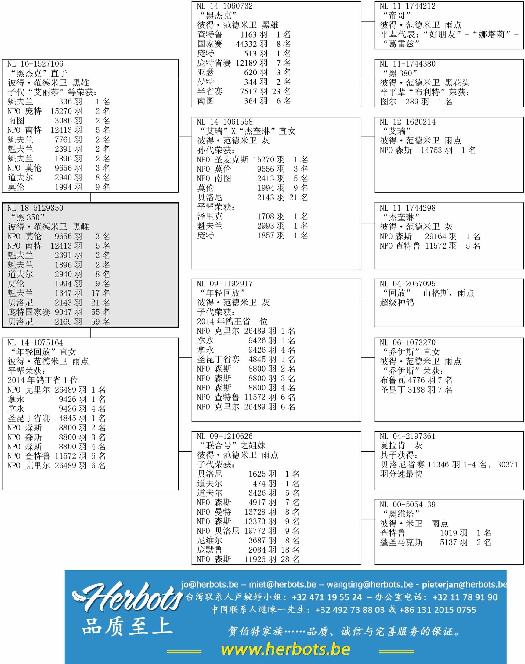 半平辈荣获: 14年鸽王省1位 – NPO 克里尔 26,489羽1名 – 拿永 9,426羽1名和4名 - 圣昆丁省赛 4,845羽1名 – NPO 森斯 8,800羽2名、3名和4名 – NPO 查特鲁 11,572羽6名 – NPO 克里尔 26,489羽6名