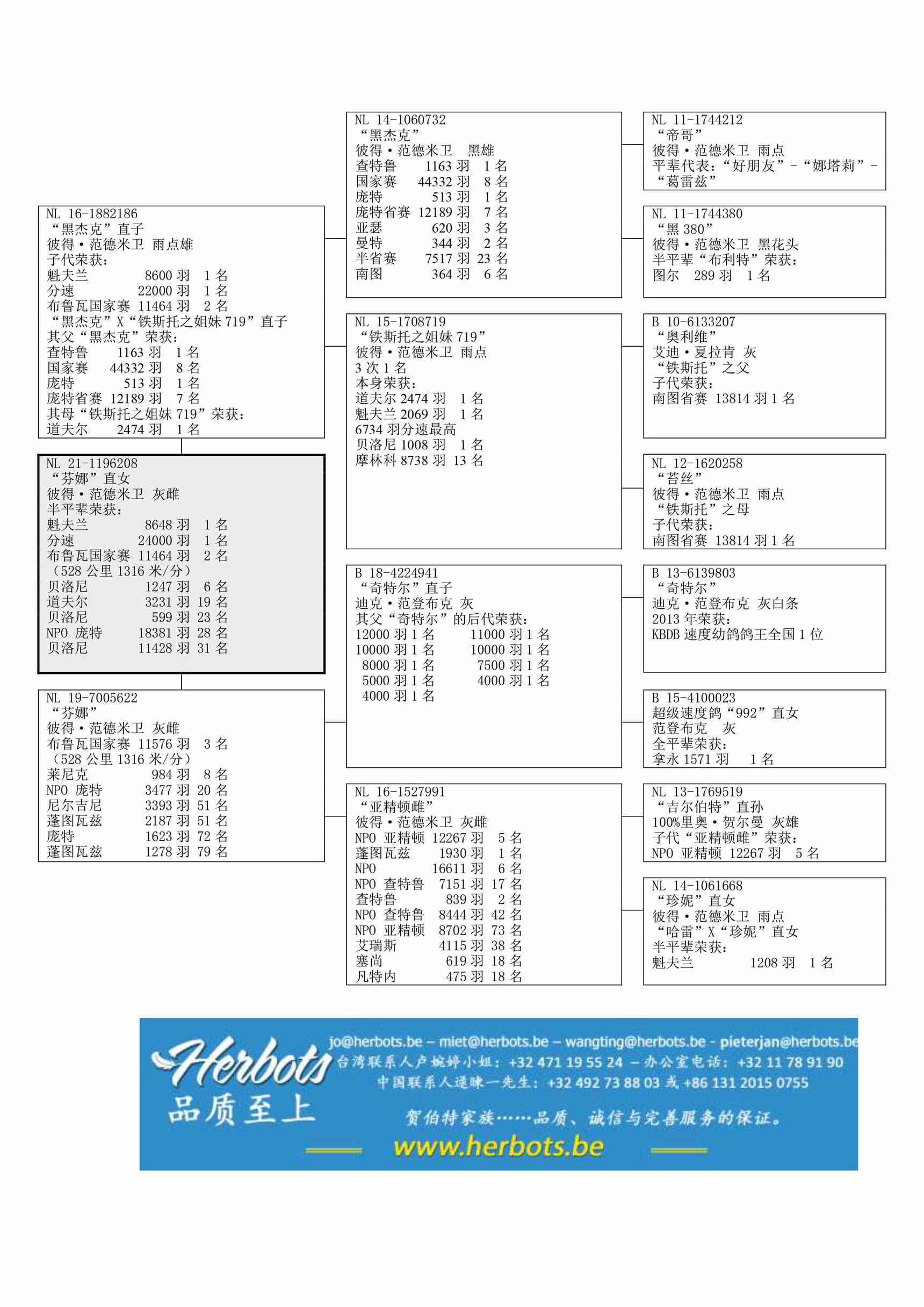 魁夫兰 8,648羽1名 (24,000羽分速最高) - 布鲁瓦国家赛 11,464羽2名 – 贝洛尼 1,247羽6名 - 道夫尔 3,231羽19名 – NPO 贝洛尼 18,381羽28名- 贝洛尼 11,428羽31名
