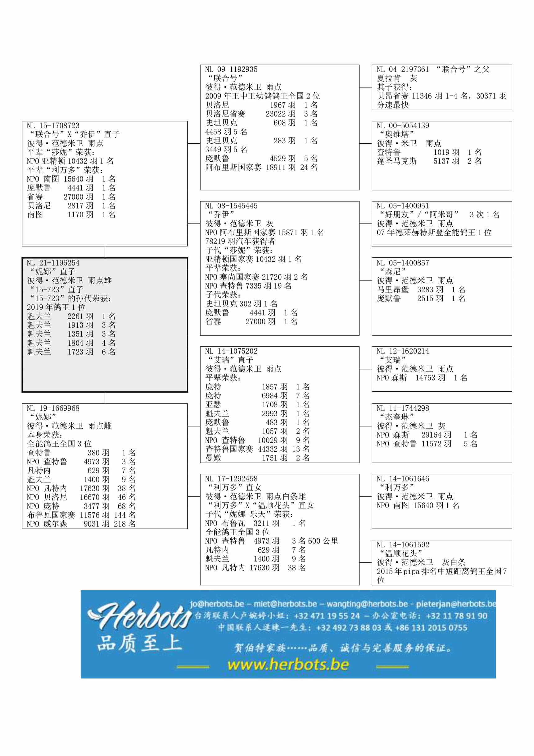 荣获:       全能鸽王全国3位 - NPO 查特鲁4,973羽3名 - NPO 凡特内 17,630羽38名 - NPO贝洛尼 16,670羽46名