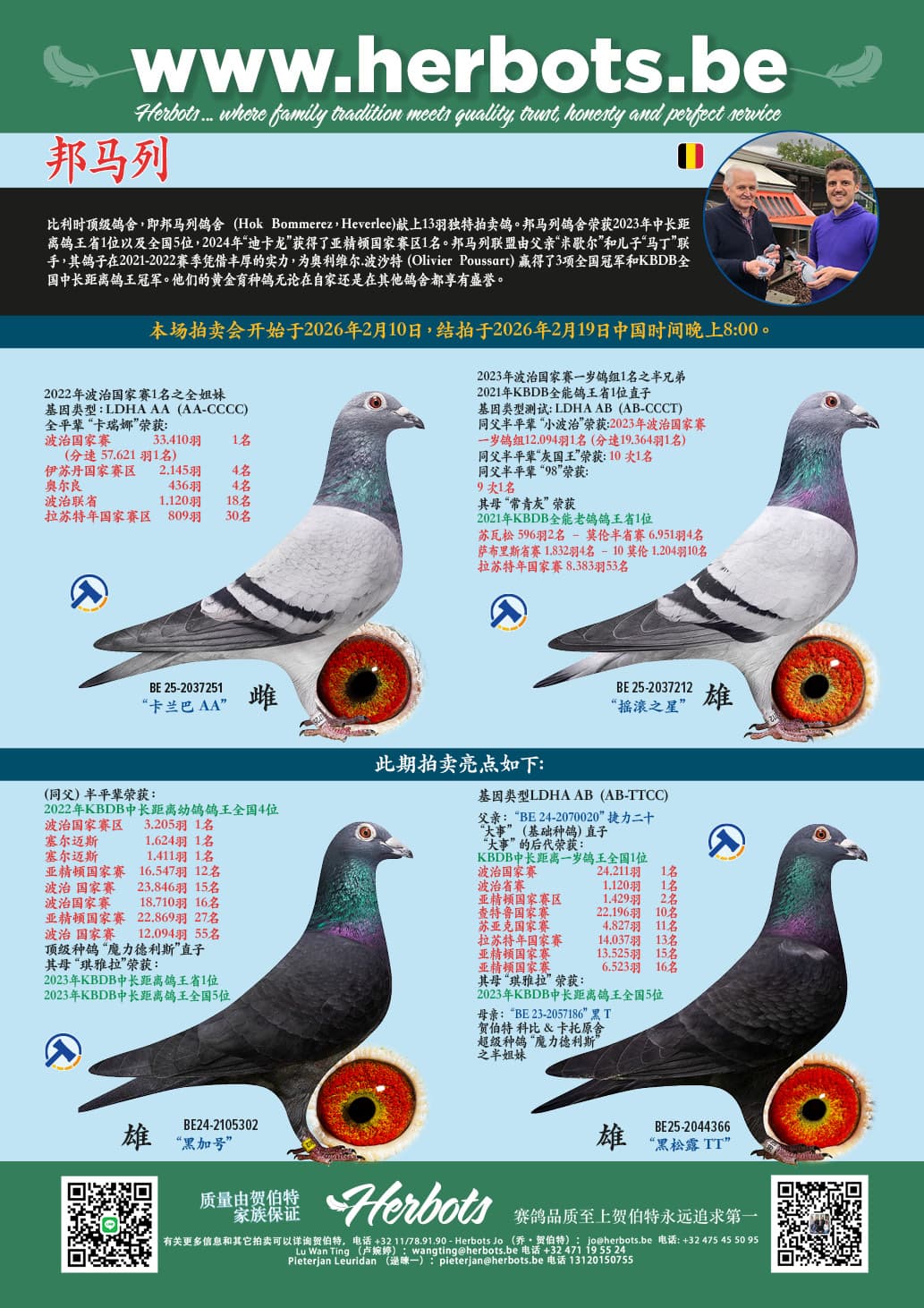 比利时顶级鸽舍,即邦马列鸽舍 (Hok Bommerez,Heverlee)献上13羽独特拍卖鸽。邦马列鸽舍荣获2023年中长距离鸽王省1位以及全国5位,2024年“迪卡龙”获得了亚精顿国家赛区1名。邦马列联盟由父亲“米歇尔”和儿子“马丁”联手,其鸽子在2021-2022赛季凭借丰厚的实力,为奥利维尔.波沙特(Olivier Poussart)赢得了3项全国冠军和KBDB全国中长距离鸽王冠军。他们的黄金育种鸽无论在自家还是在其他鸽舍都享有盛誉。