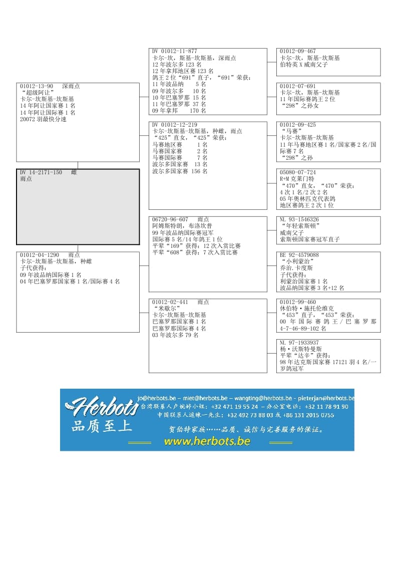此鸽舍国家赛4次获得1名半平辈“DV 4437-14-62”之子代“NL 18-1293545新詹森雌”获得:19年马赛国家赛883公里2735羽 1名国际赛雌鸽组 2651羽 1名国际赛 10029羽 2名父亲:DV 01012-13-90“超级阿让”14年阿让国际赛1名20072羽最快分速