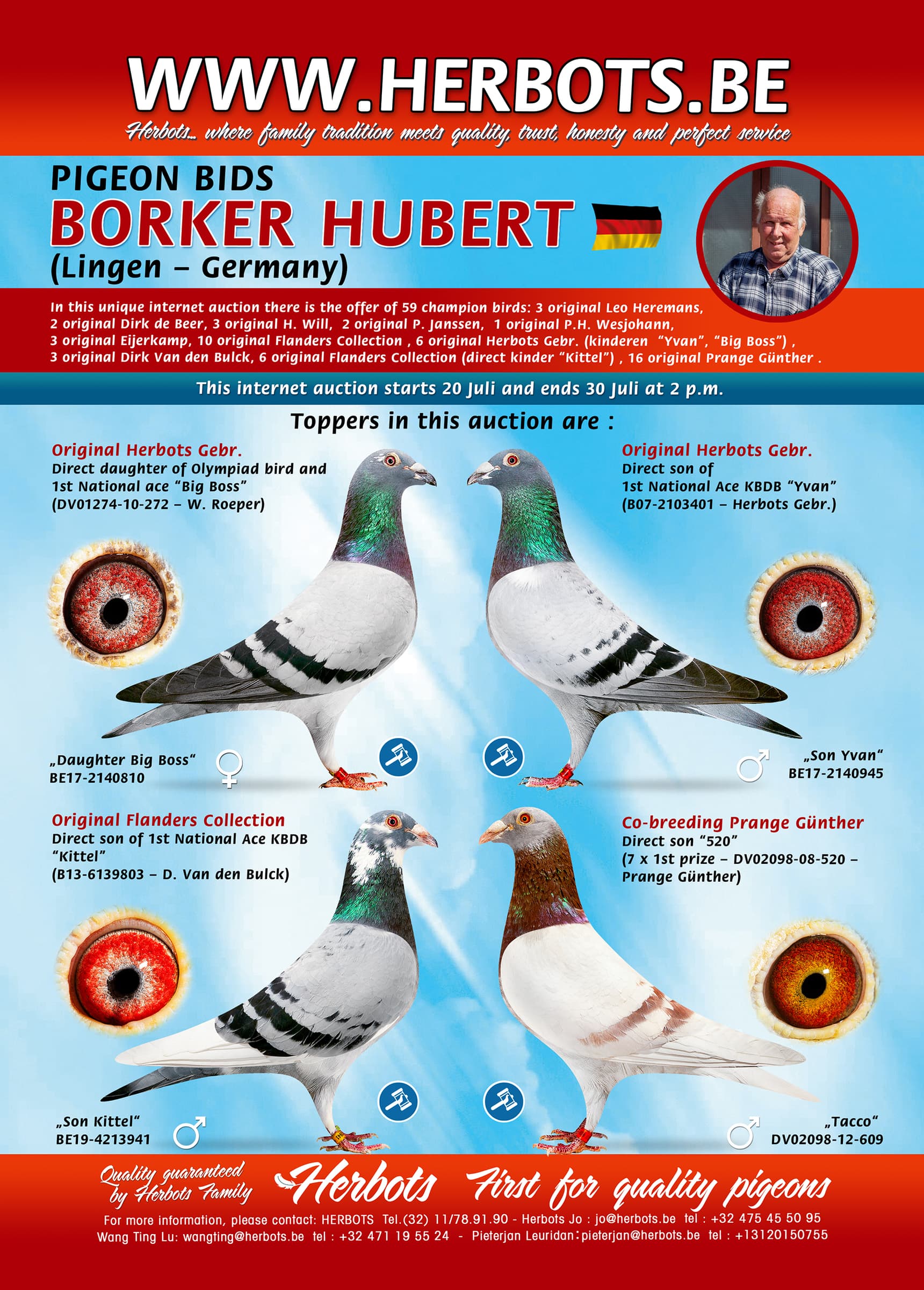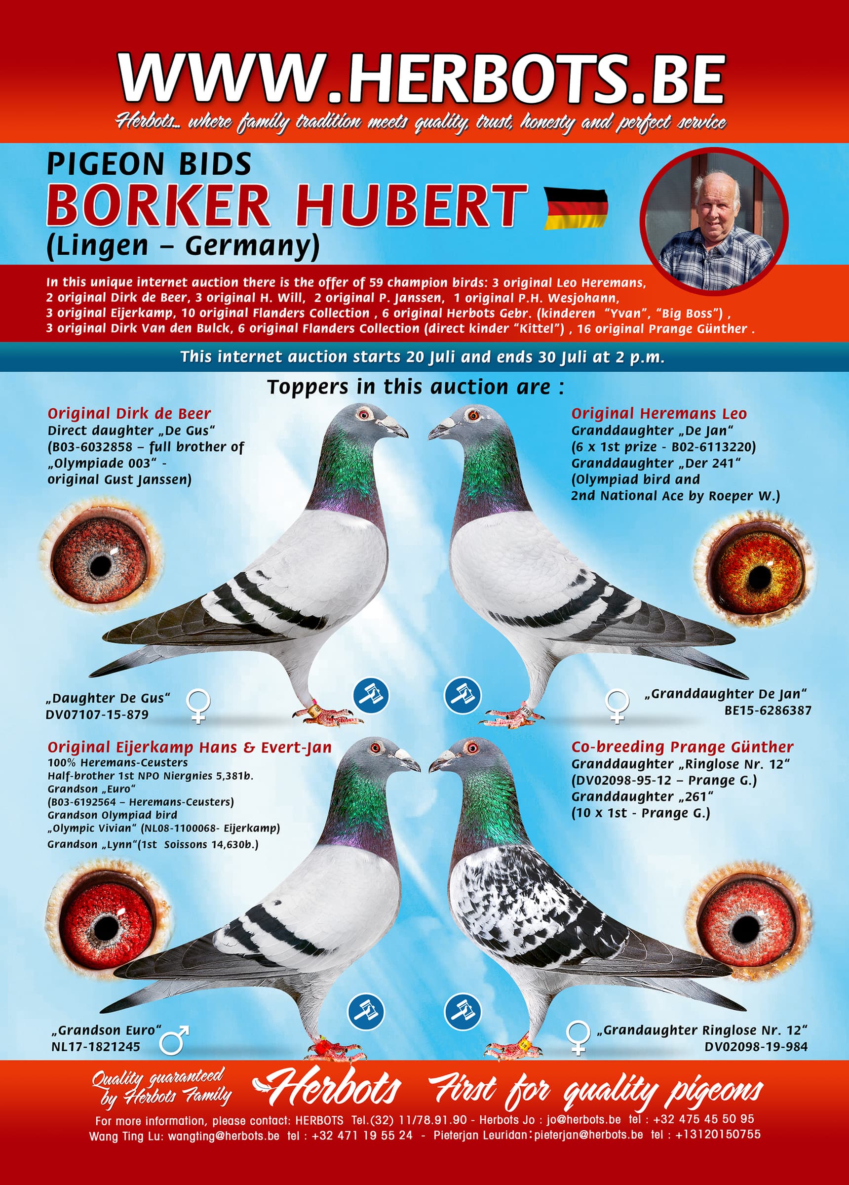 The breeding loft of Hubert Borker is probably one of the best high-class breeding lofts in Germany, but due to complaints with neighbours and authorities Hubert is forced to bring all his breeders into an exclusive internetauction