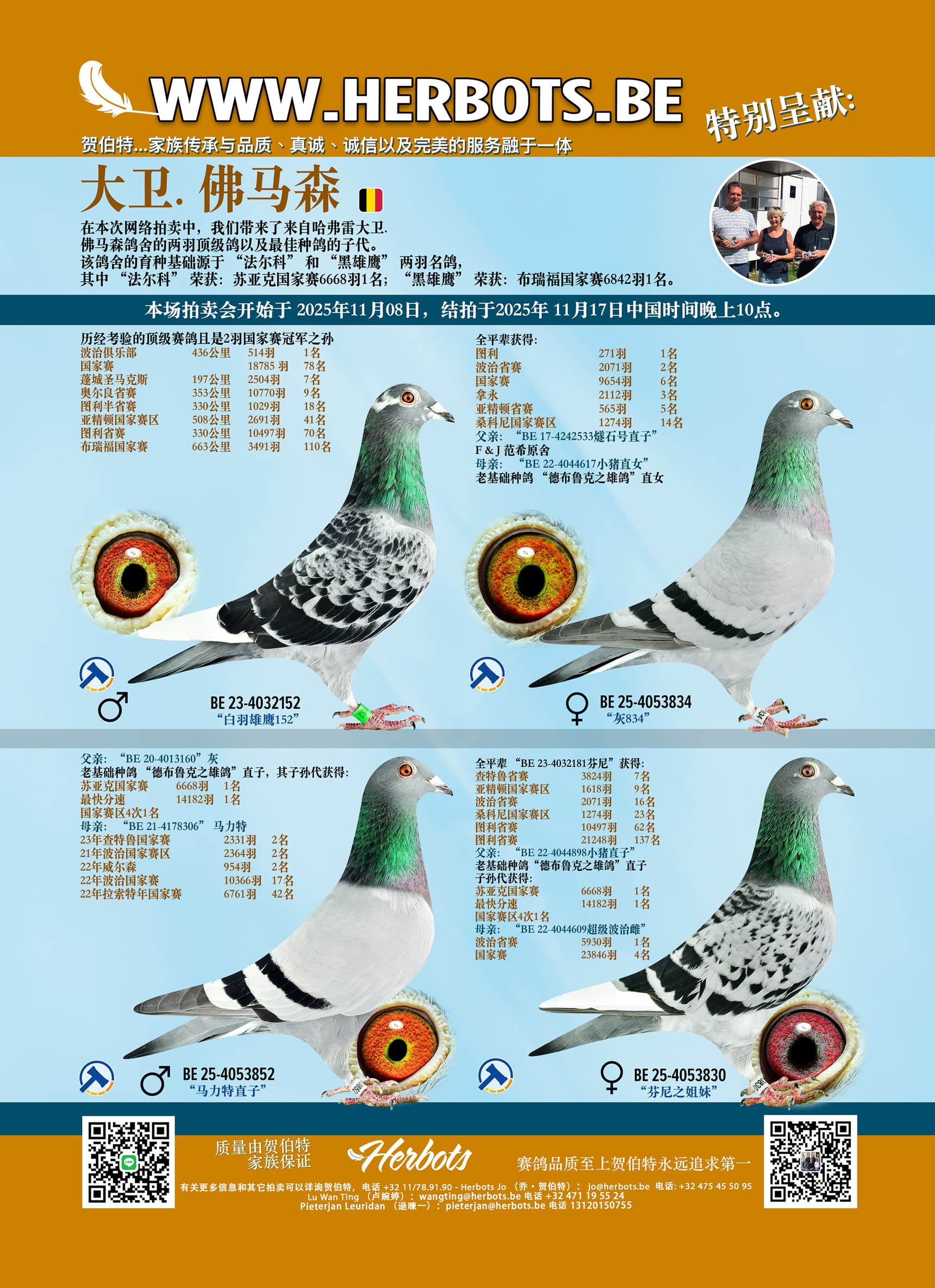 在本次网络拍卖中,我们带来了来自哈弗雷大卫. 佛马森鸽舍的两羽顶级鸽以及最佳种鸽的子代。该鸽舍的育种基础源于 “法尔科” 和 “黑雄鹰” 两羽名鸽,其中 “法尔科” 荣获:苏亚克国家赛6668羽1名;“黑雄鹰” 荣获:布瑞福国家赛6842羽1名。