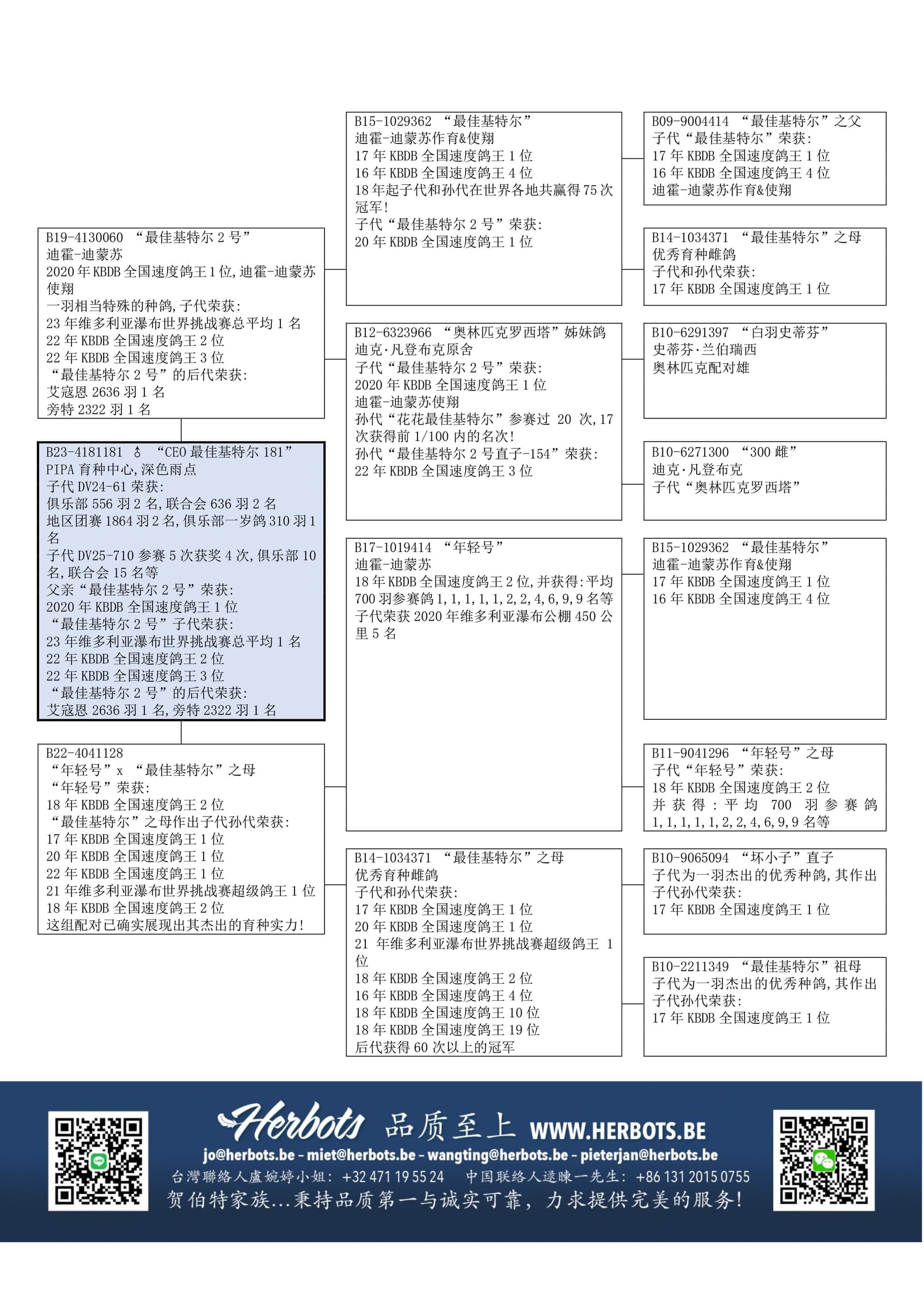 出自“年轻号” (18年KBDB全国速度一岁鸽鸽王2位) x “最佳基特尔之母”