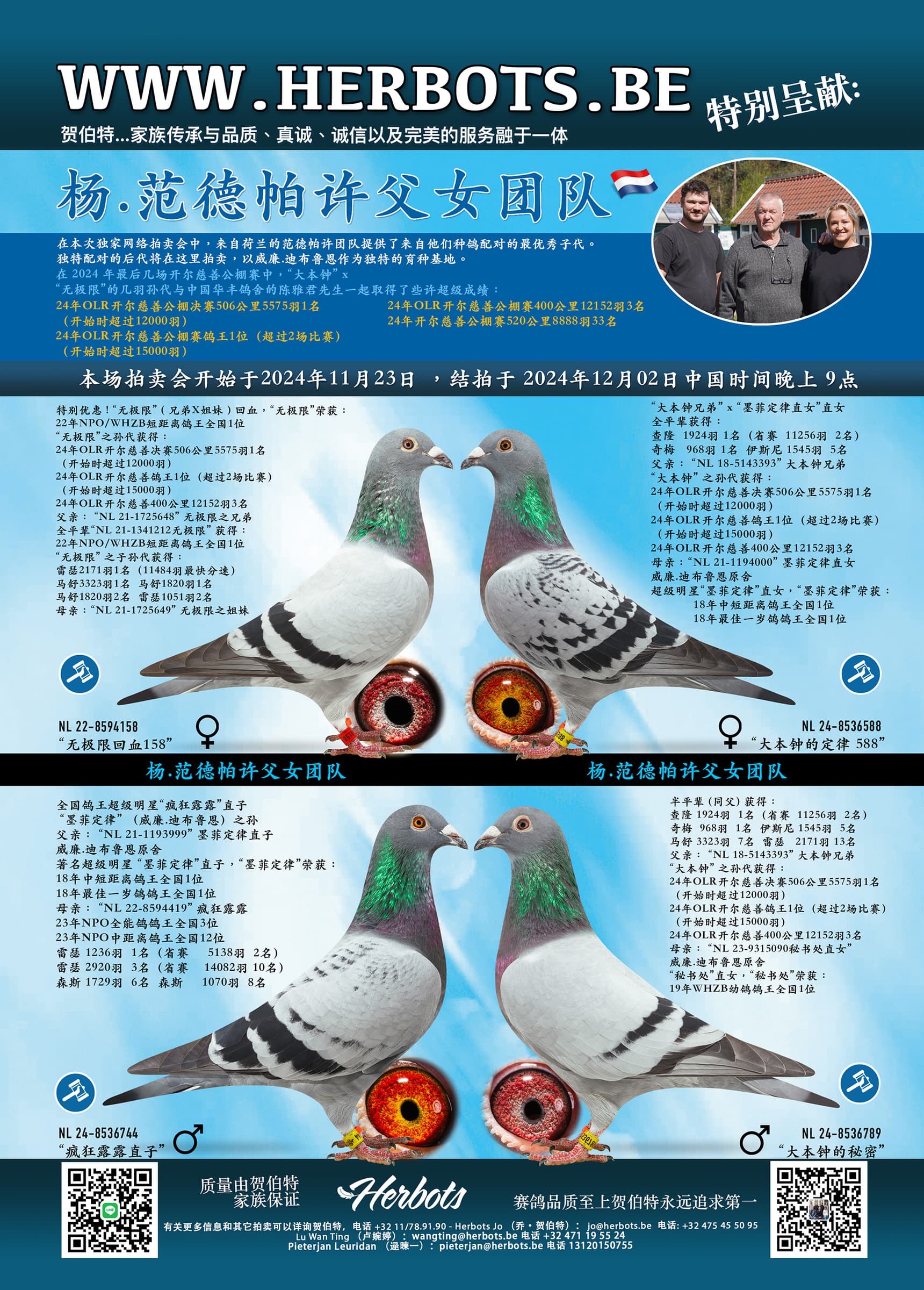 在本次独家网络拍卖会中,来自荷兰的范德帕许团队提供了来自他们种鸽配对的最优秀子代。独特配对的后代将在这里拍卖,以威廉.迪布鲁恩作为独特的育种基地。