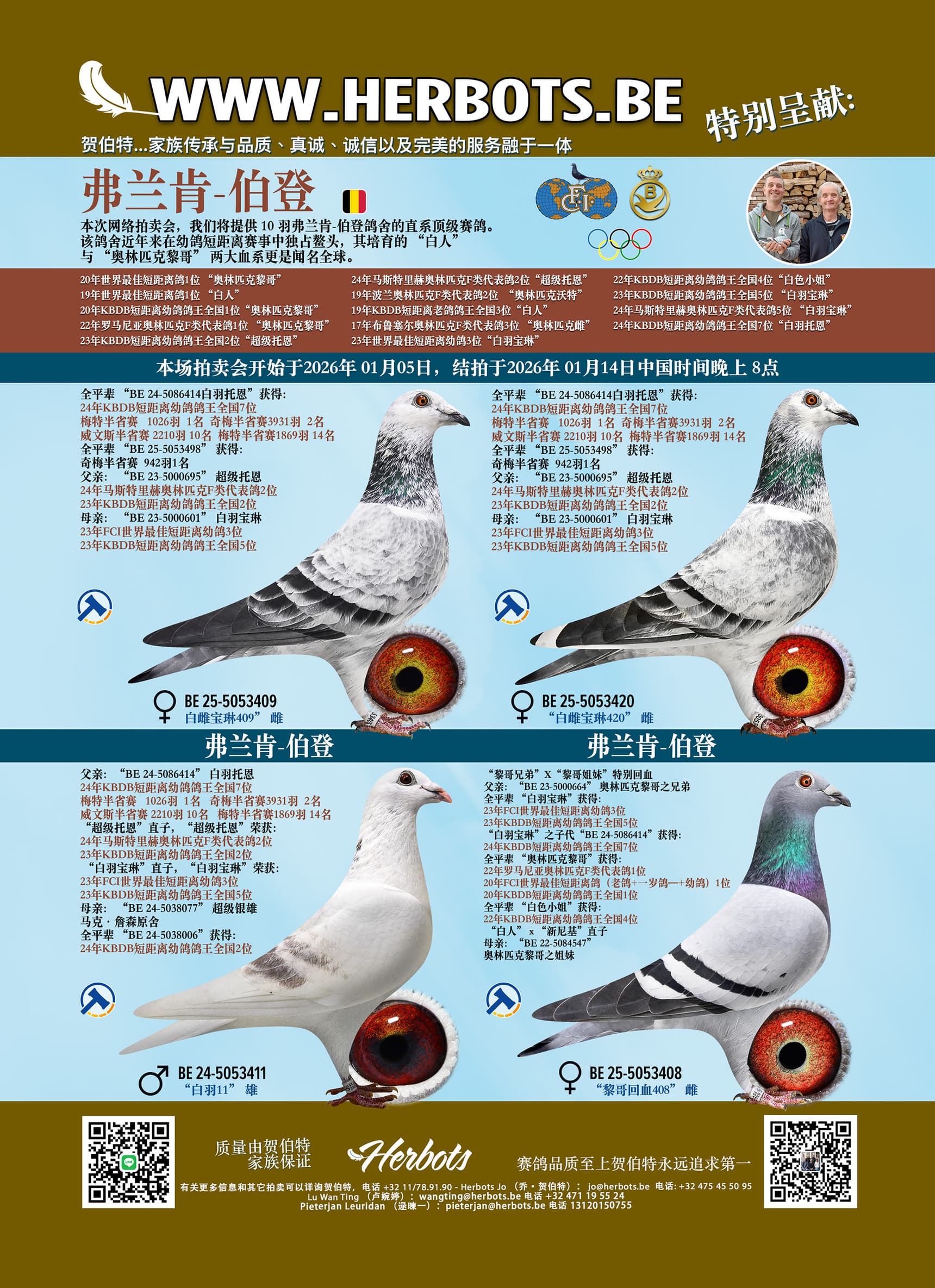在本次网络拍卖中,我们提供10羽来自弗兰肯-伯登的原舍顶级鸽子,近年来,该鸽舍在幼鸽的短距离比赛中占据主导地位,并以“白人”和“奥林匹克黎哥”家族而闻名于世。