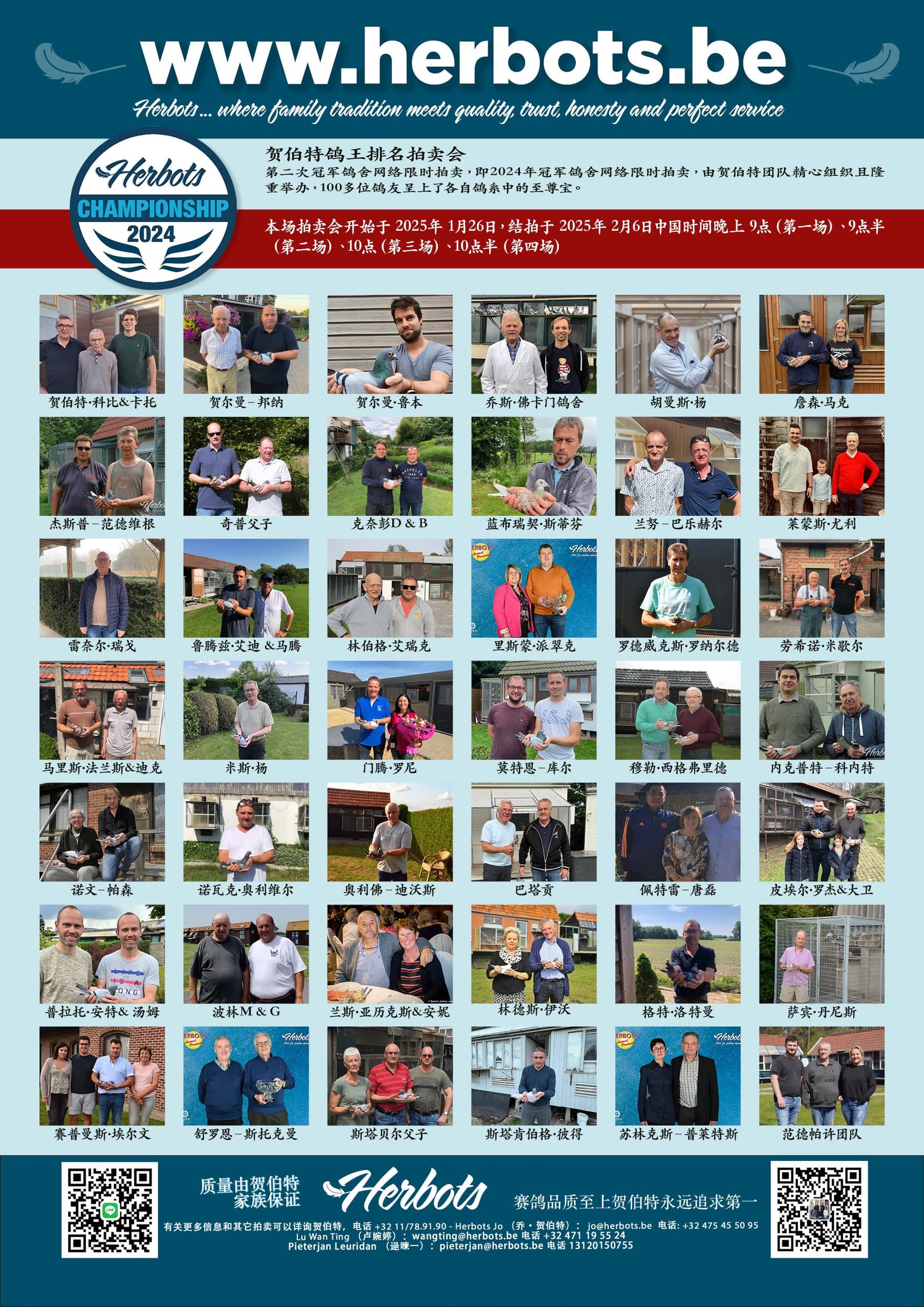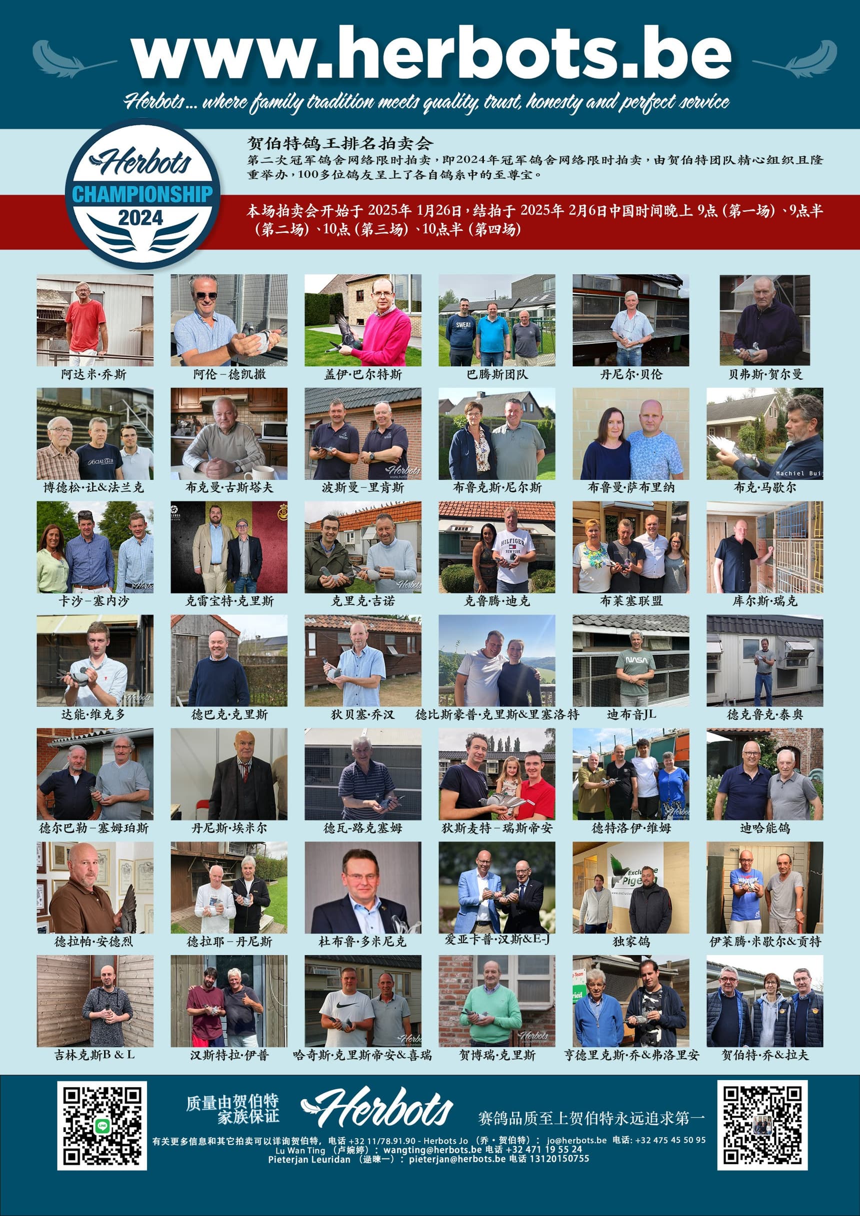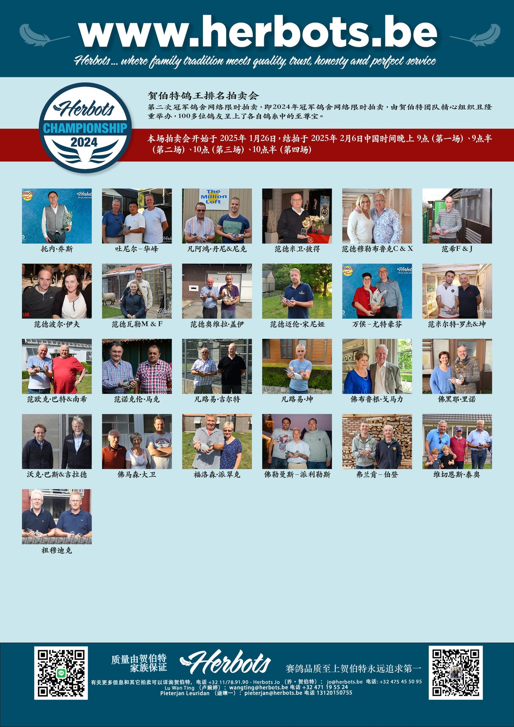 拍卖鸽们将于 2025 年 2 月 1 日在 Hall Van der Valk – Nijvel South (Chaussee De Mons 22, 1400 Nijvel) 的贺伯特庆典上展出。