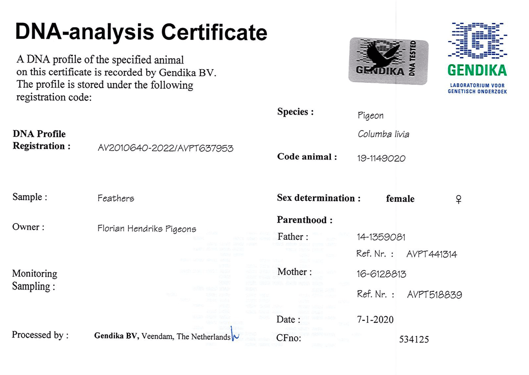 其父冠军鸽 “小吉拉德” 荣获: NPO 8,278羽2名 – NPO 1,310羽4名 – NPO 5,537羽5名 - NPO 1,326羽11名 - 省赛 10,912羽13名 – NPO 5,166羽17名