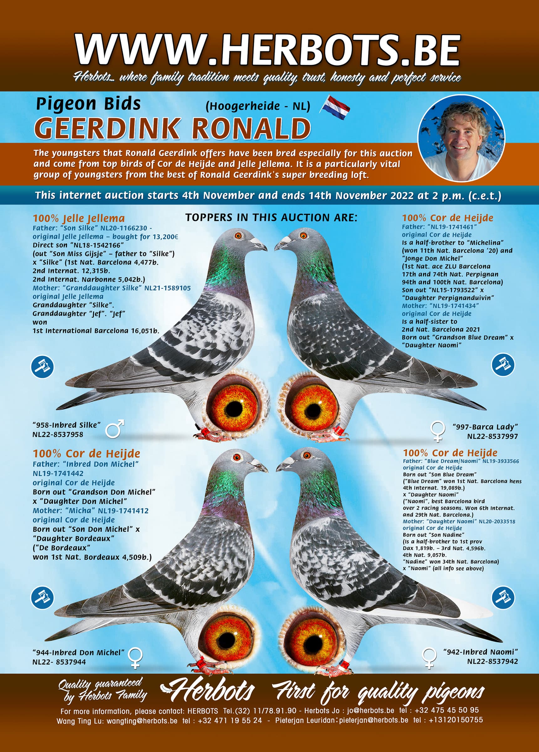 本场拍卖会提供9羽罗那德·格尔丁克耶勒·耶勒玛及科尔海德种鸽出的幼鸽