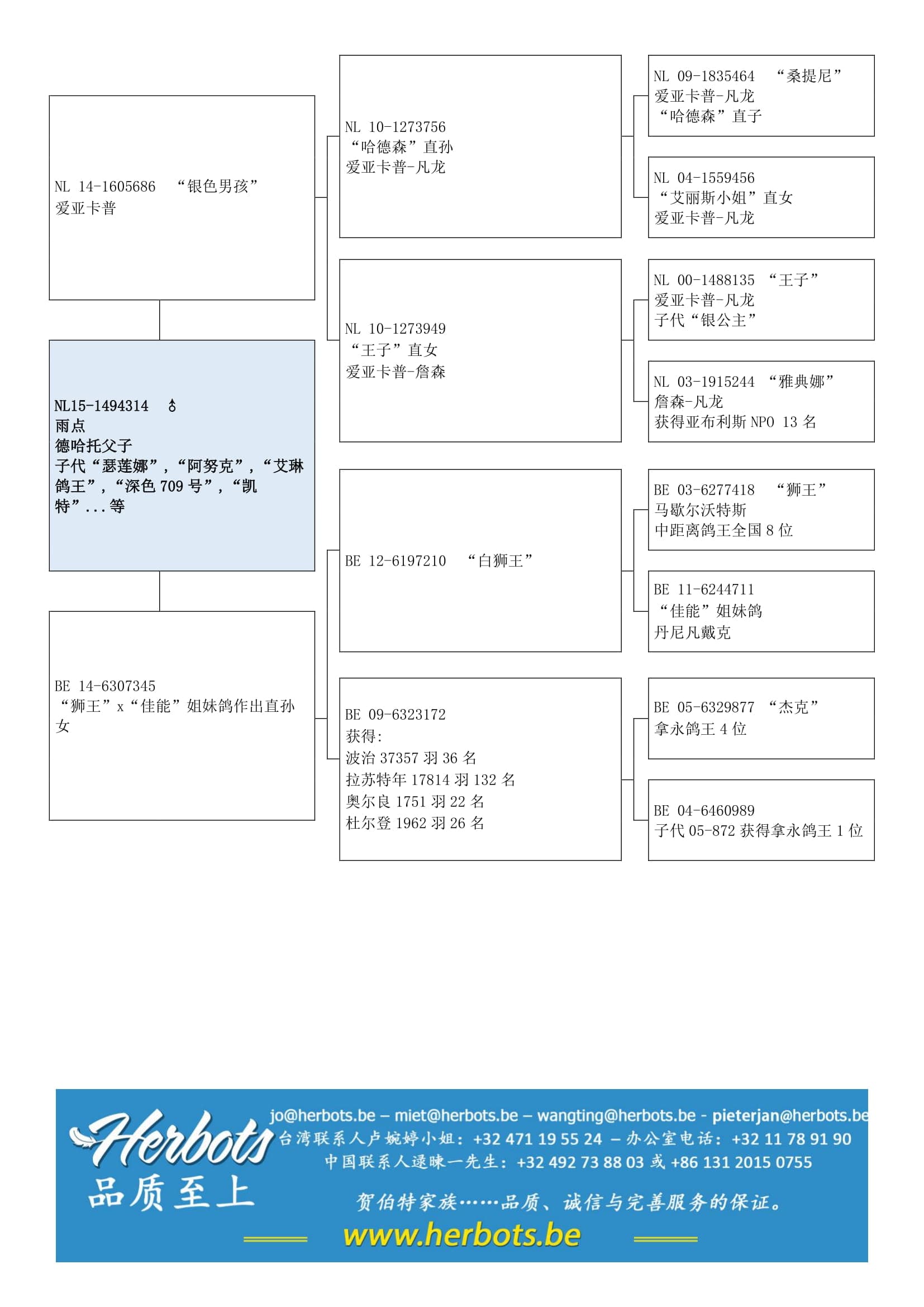 “狮王” (KBDB鸽王全国8位,马歇尔沃特斯的基础种鸽) x “佳能姊妹鸽”(丹尼凡戴克)作出直子