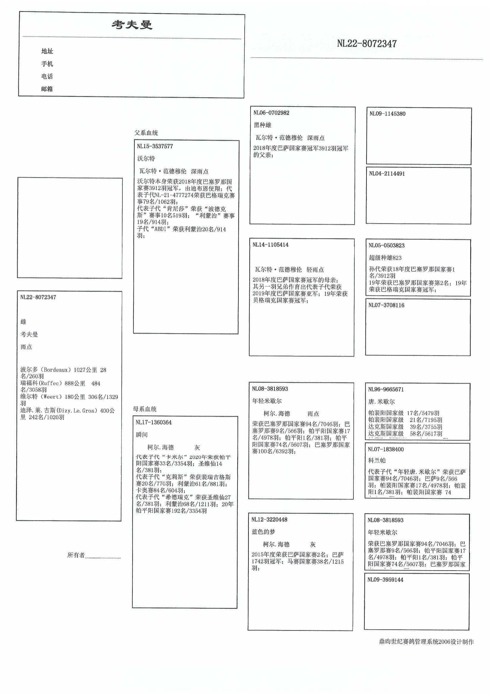 出自: “青年唐.米歇尔 ” (NL08-3818593) x “杰西的孙女” (赢得 13名 全国贝格瑞克 4,096羽)