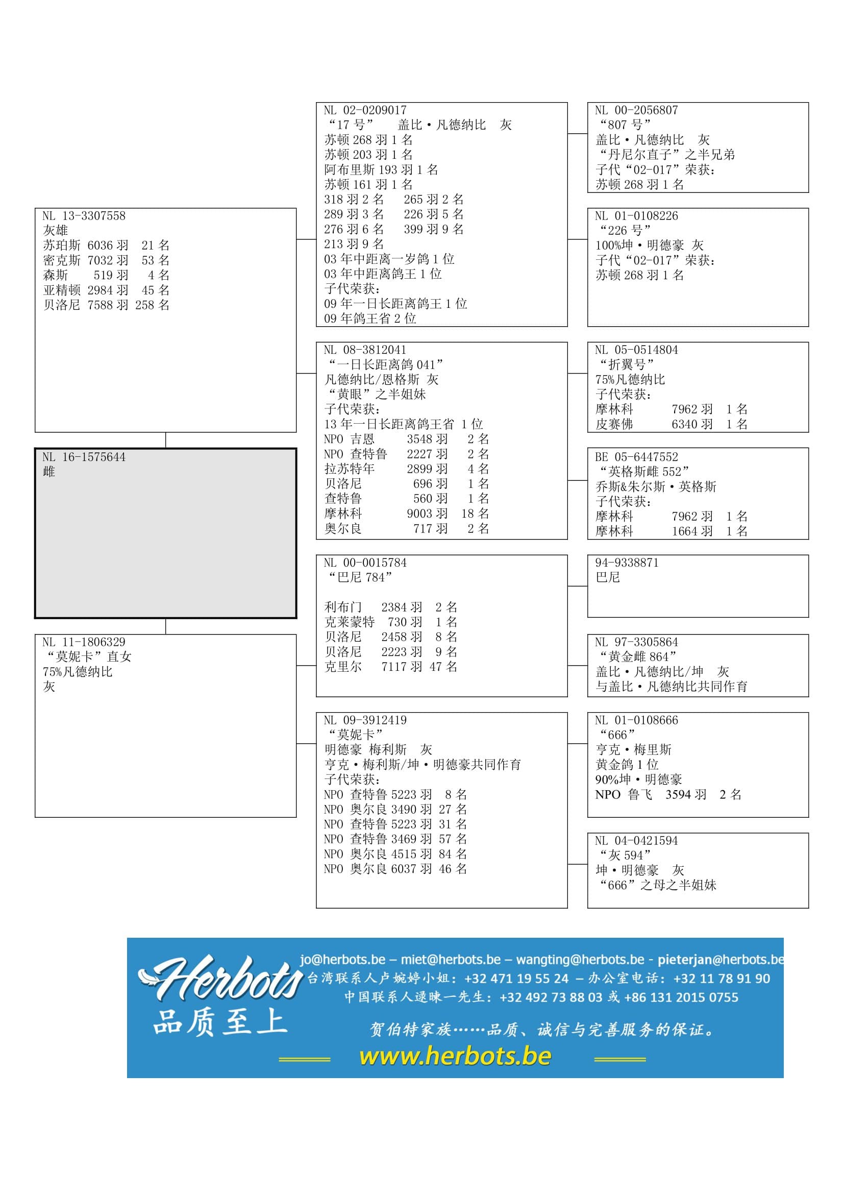 子代荣获:13年鸽王省1位 – NPO 吉恩 3,548羽2名- NPO 查特鲁 2,227羽2名 – 拉苏特年2,899羽4名 – 贝洛尼 696羽1名 – 查特鲁 560羽1名- 摩林科 9,003羽18名 – 奥尔良 717羽2名