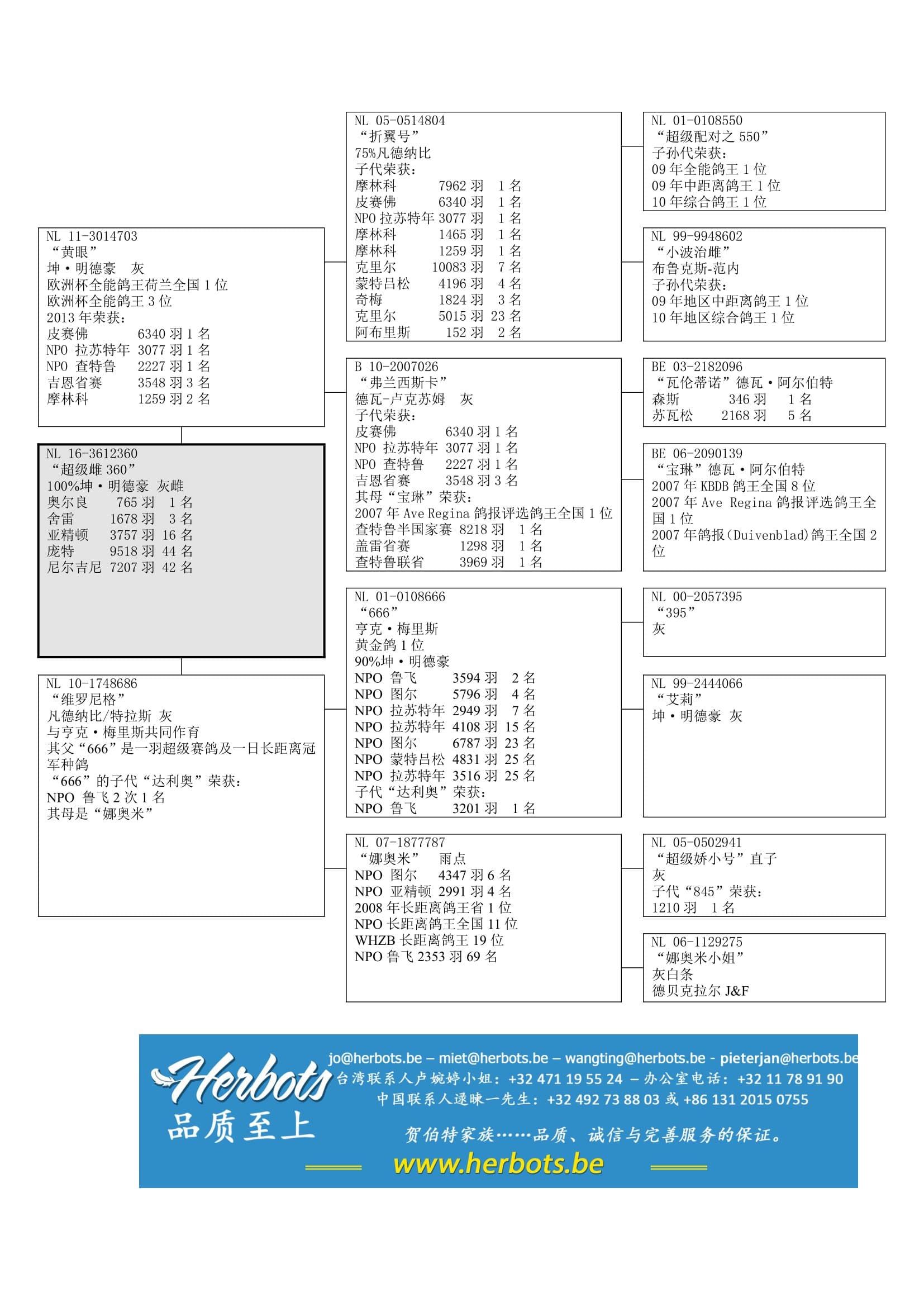 作出多代顶级鸽,在各种类型的比赛中获得高位翔绩,如2023年阿让国际赛1名等;在世界各地获得成千上万次冠军。