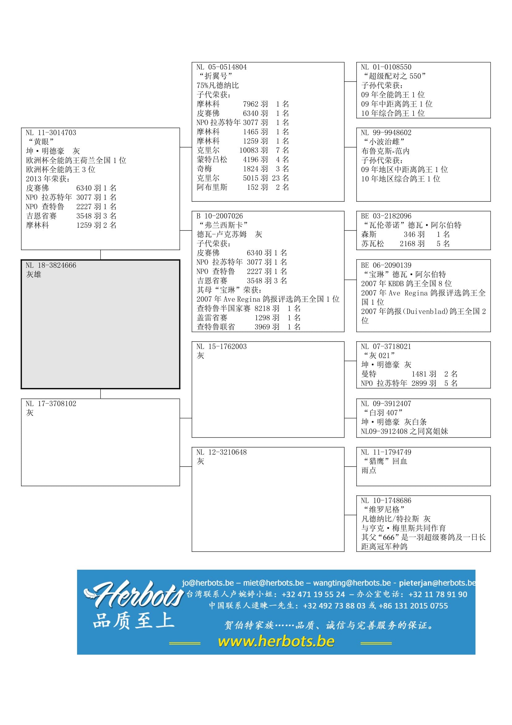 作出多代顶级鸽,在各种类型的比赛中获得高位翔绩,如2023年阿让国际赛1名等;在世界各地获得成千上万次冠军。
