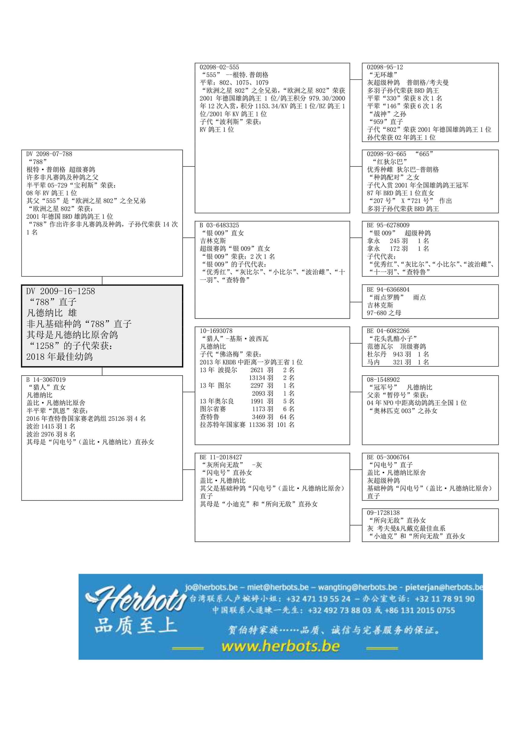“788”直子,“788”是: 基础种鸽 - 普朗格原舍 “猎人”直孙, “猎人”的子代荣获:KBDB鸽王省1位 (盖比·凡德纳比)