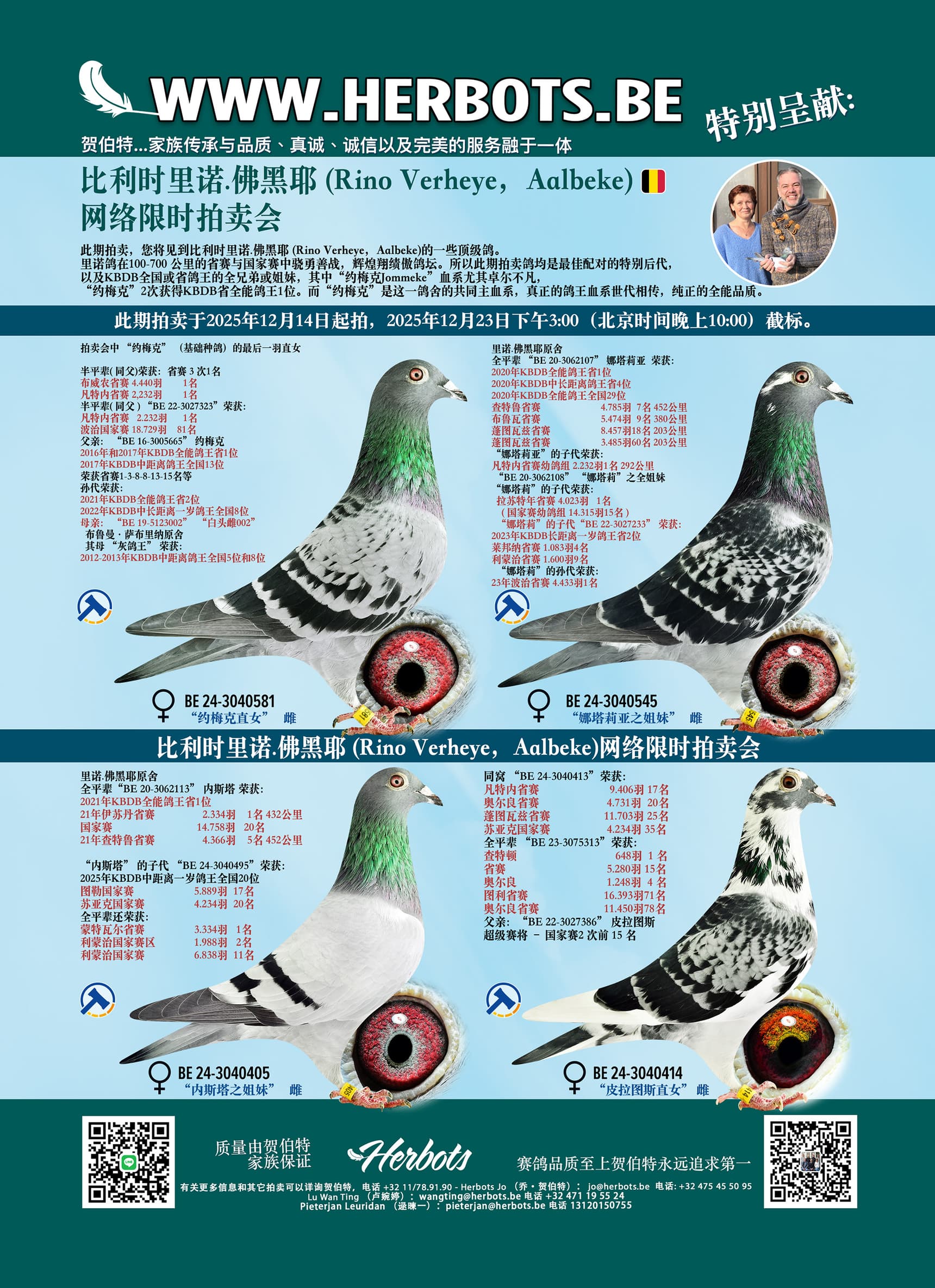 此期拍卖,您将见到比利时里诺.佛黑耶 (Rino Verheye,Aalbeke)的一些顶级鸽。里诺鸽在100-700 公里的省赛与国家赛中骁勇善战,辉煌翔绩傲鸽坛。所以此期拍卖鸽均是最佳配对的特别后代,以及KBDB全国或省鸽王的全兄弟或姐妹,其中“约梅克Jommeke”血系尤其卓尔不凡,“约梅克”2次获得KBDB省全能鸽王1位。而“约梅克”是这一鸽舍的共同主血系,真正的鸽王血系世代相传,纯正的全能品质。