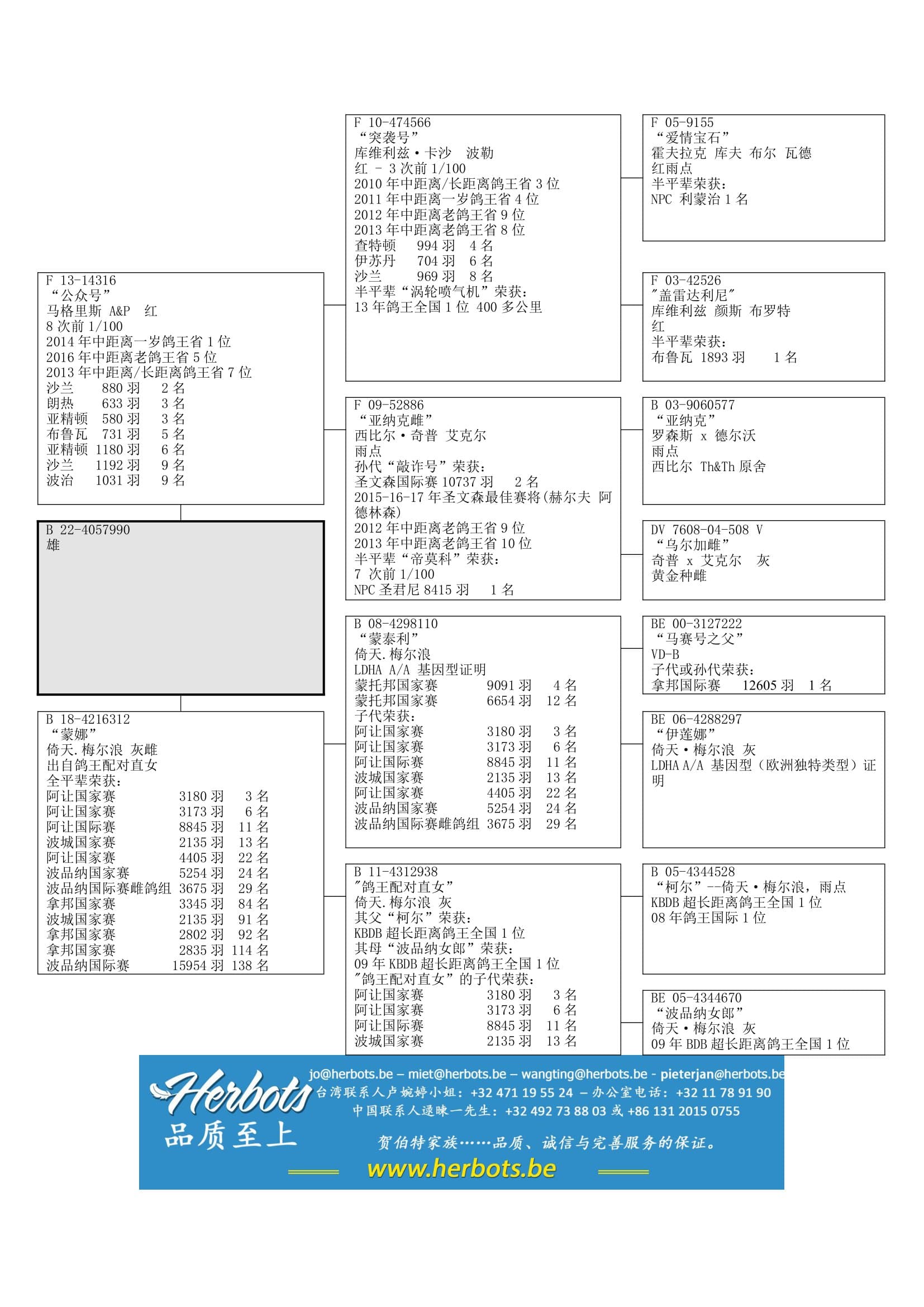 中距离一岁鸽王省1位 – 中距离老鸽王省5位 - 幼鸽鸽王省7位 – 880羽2名 – 633羽3名 – 580羽3名 – 731羽5名 – 1,180羽6名 – 1,192羽9名 – 1,031羽9名