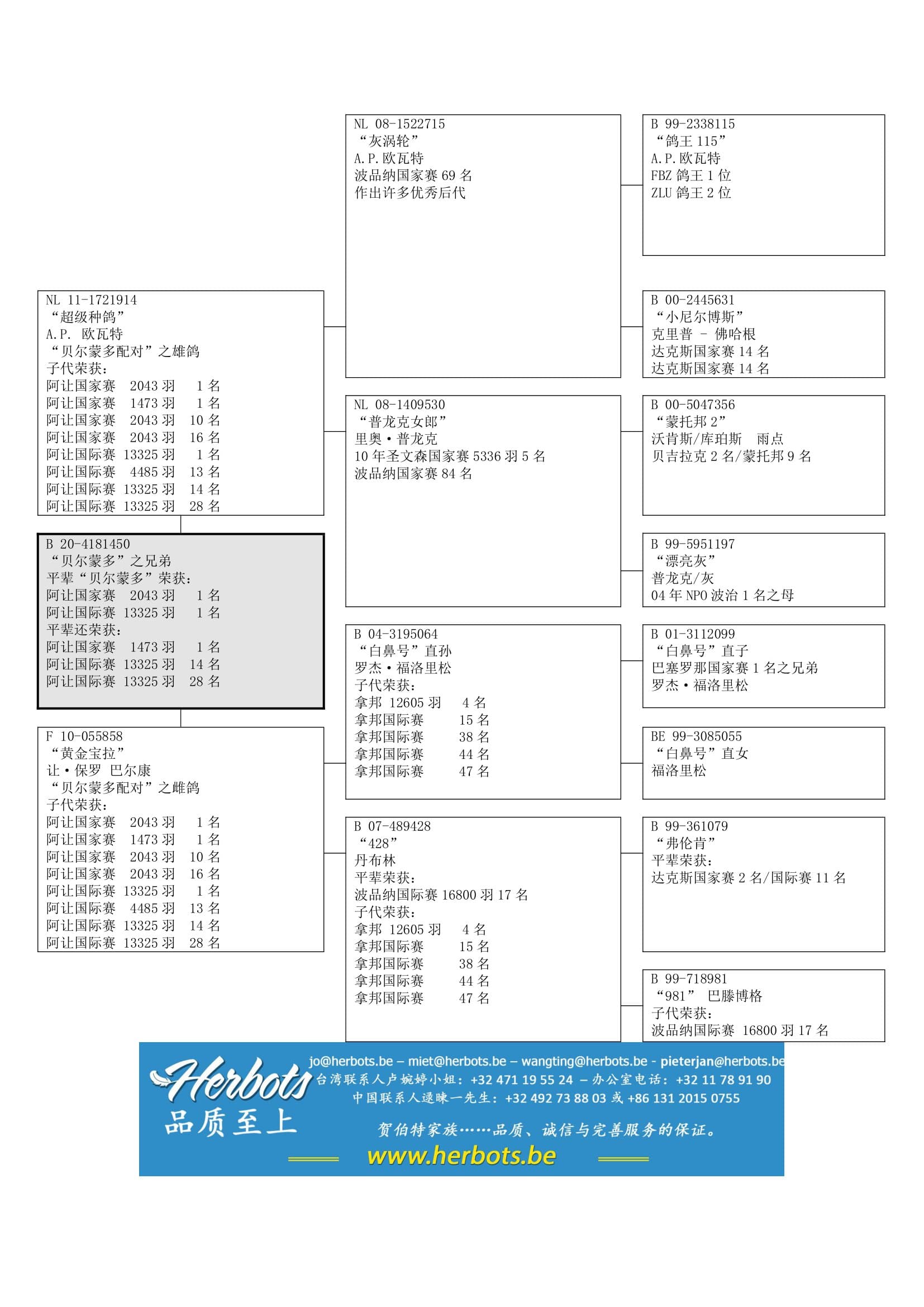 阿让国家赛法国 1,473羽1名 – 阿让国际赛 一岁鸽组 4,485羽13名 – 阿让国际赛 13,325羽28名 – 圣文森国际赛 11,515羽93名
