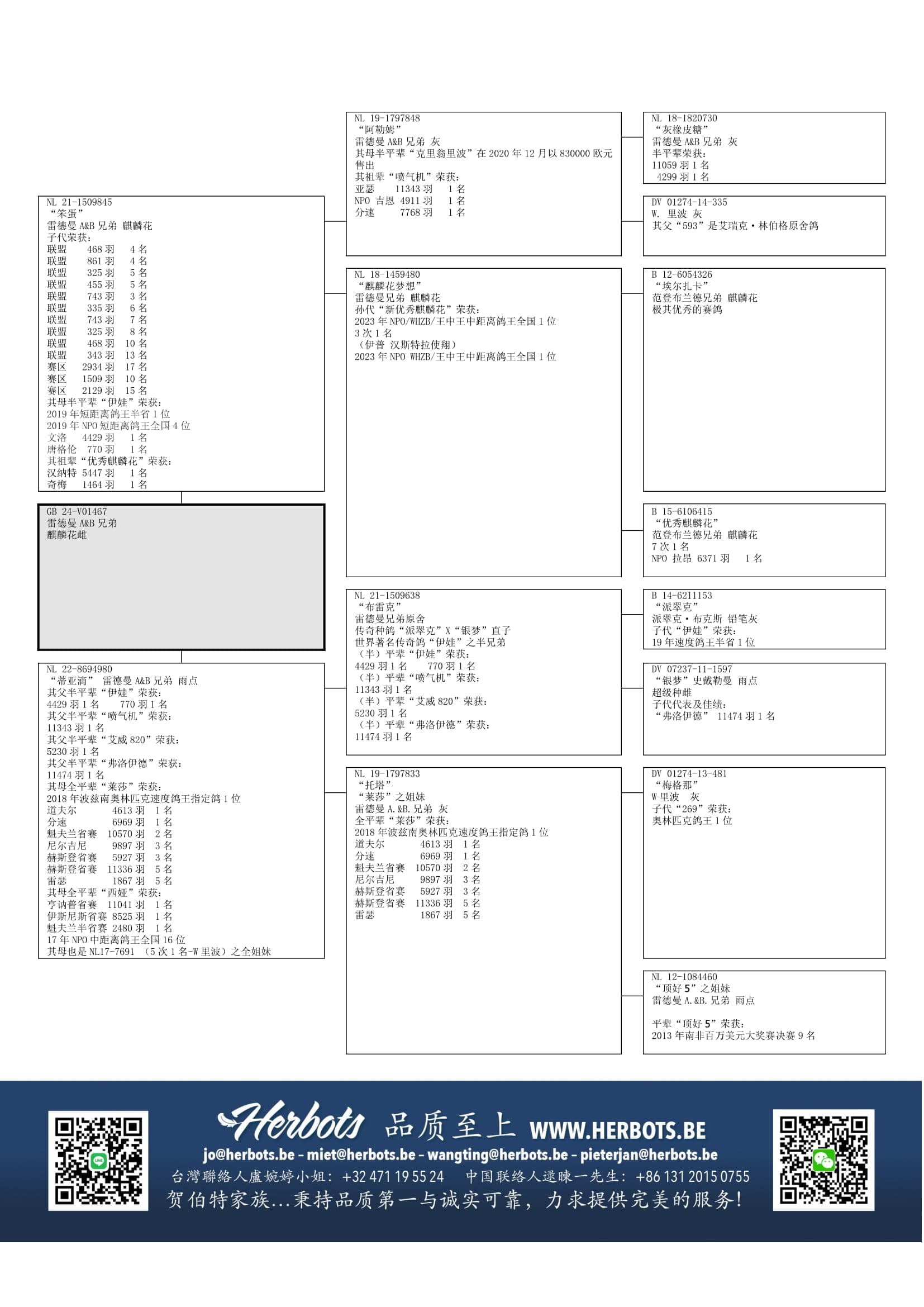 提拉” (子代荣获:国家赛 / 省赛1名-1名-1名-2名-3名-3名-3名-3名-4名-5名-5名-8名-13名-14名等 - 孙代荣获:国家赛/NPO/省赛 12次1名 - 曾孙代荣获:荷兰奥林匹克鸽王1位, 鸽王全国1位 &