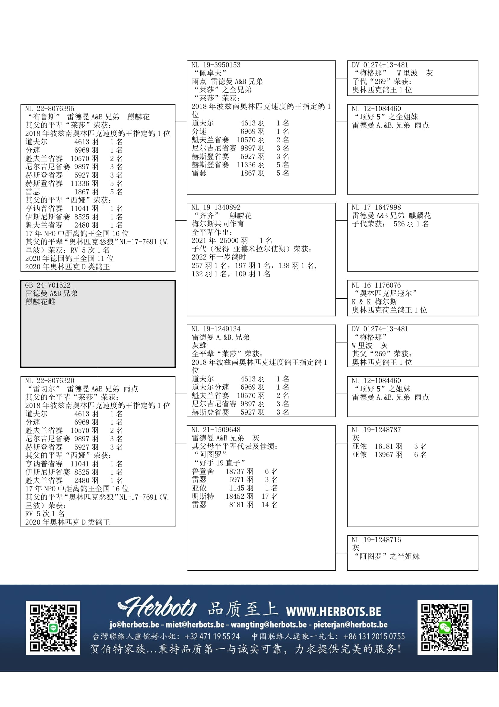 提拉” (子代荣获:国家赛 / 省赛1名-1名-1名-2名-3名-3名-3名-3名-4名-5名- 5名-8名-13名-14名等 - 孙代荣获:国家赛/NPO/省赛 12次1名 - 曾孙代荣获:荷兰奥林匹克鸽王1位, 鸽王全国1位 &  NPO 1名) – 等等