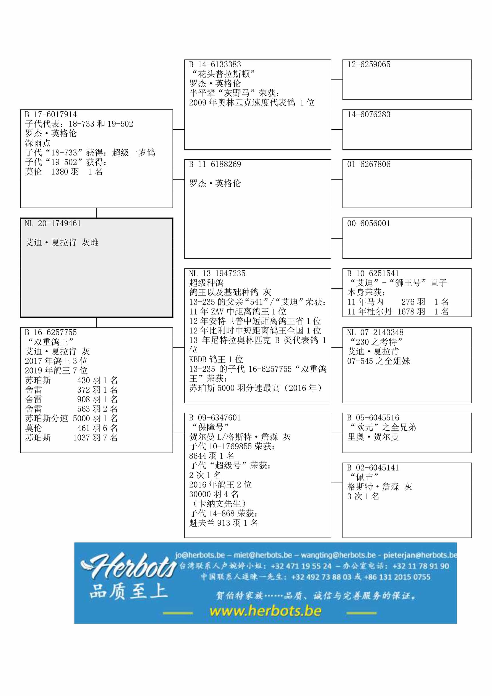 “双鸽王”直女.“双鸽王” 荣获:17年鸽王3位 – 19年鸽王7位 - 4 次1名半平辈“502-19”荣获:莫伦 1,380羽1名半平辈“733-18”荣获: 卓越一岁赛鸽