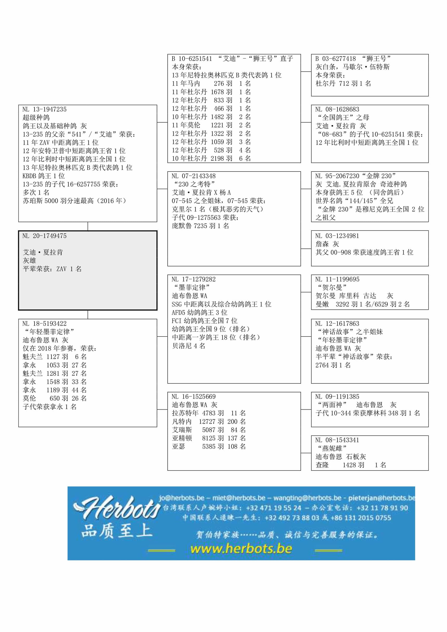 “双鸽王”之半兄弟. “双鸽王” 荣获: 17年鸽王3位19年鸽王7位 苏珀斯430羽1名 (安特卫普省赛分速 5,000羽1名)舍雷 372羽1名舍雷 908羽1名舍雷 563羽1名祖辈“艾迪”荣获:尼特拉奥林匹克鸽王以及KBDB中距离鸽王全国1位