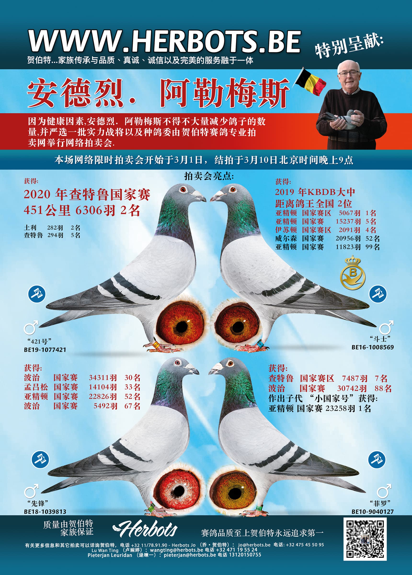 由于健康原因,安德烈.阿勒梅斯不得不大量减少他养的鸽子,因此他与贺伯特家族合作将一组经过严格挑选的优秀成绩鸽和种鸽进行网络拍卖。