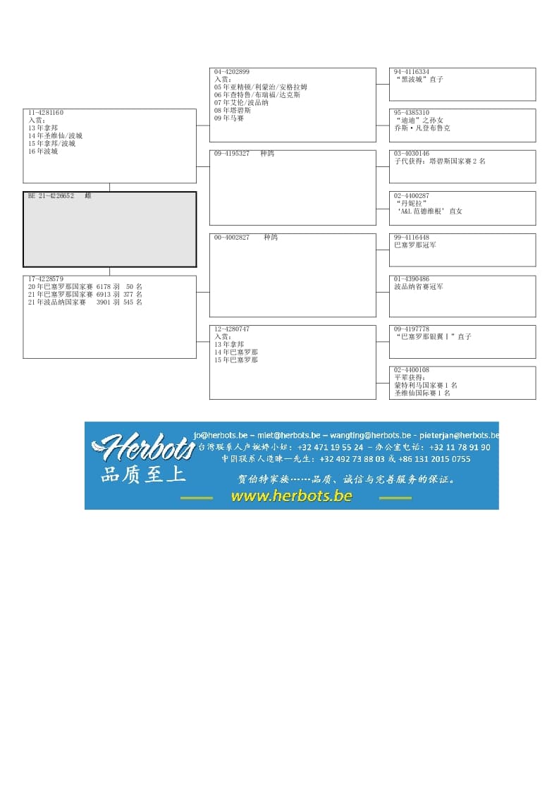 父亲:“BE 11-4281160” “60号”塔碧斯国家赛2名之半兄弟直子母亲:“BE 17-4228579巴卡79雌” 20年巴塞罗那国家赛1108公里6178羽50名21年巴塞罗那国家赛1062公里6913羽377名波品纳省赛1名之孙女祖父母之平辈获得:圣维仙国际赛1名蒙特利马国家赛1名