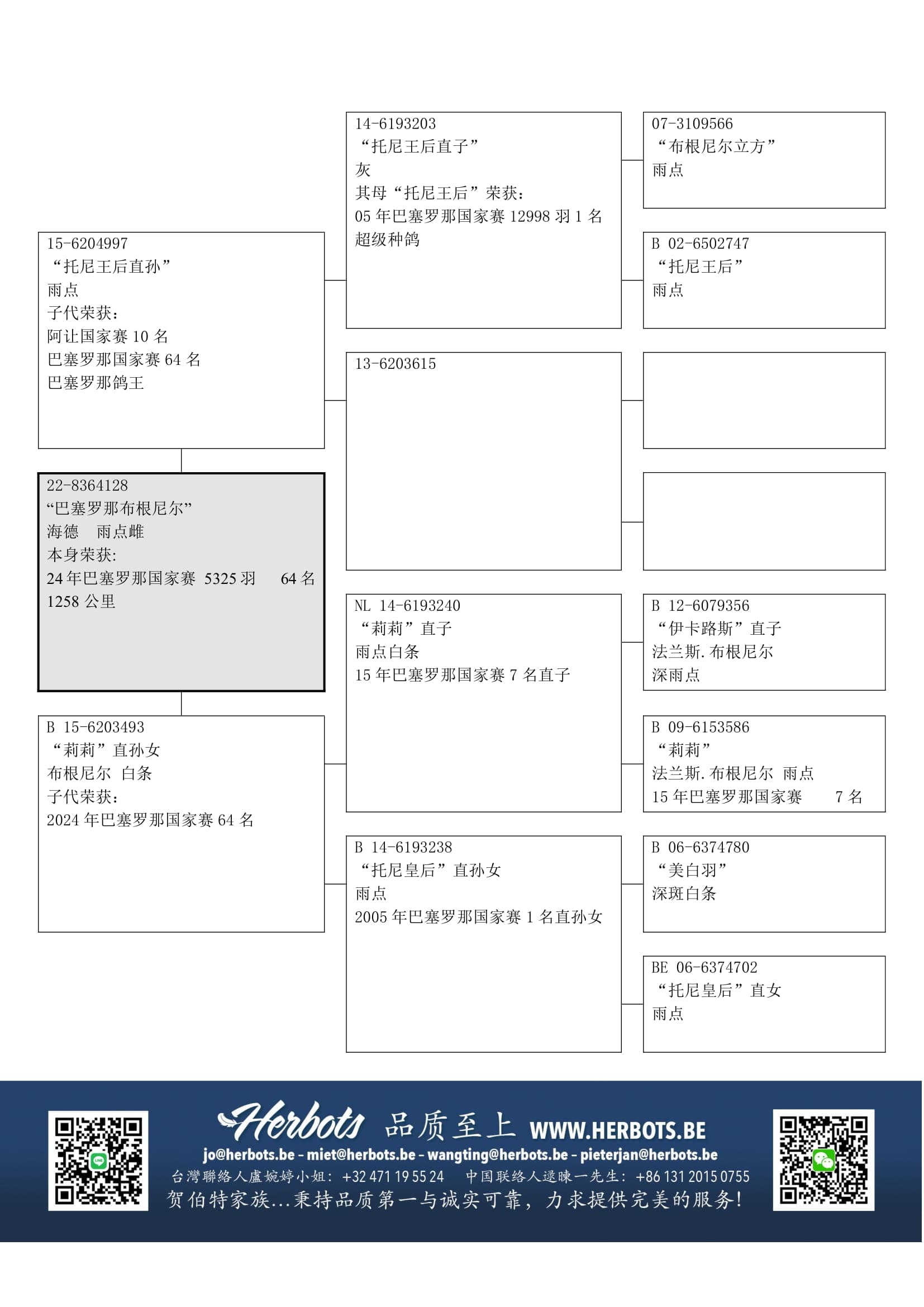 父亲: “托尼王后直孙” B15-6204997 - 布根尼尔·法兰斯原舍子代还荣获:阿让国家赛10名巴塞罗那国家赛1名的“托尼王后”直孙