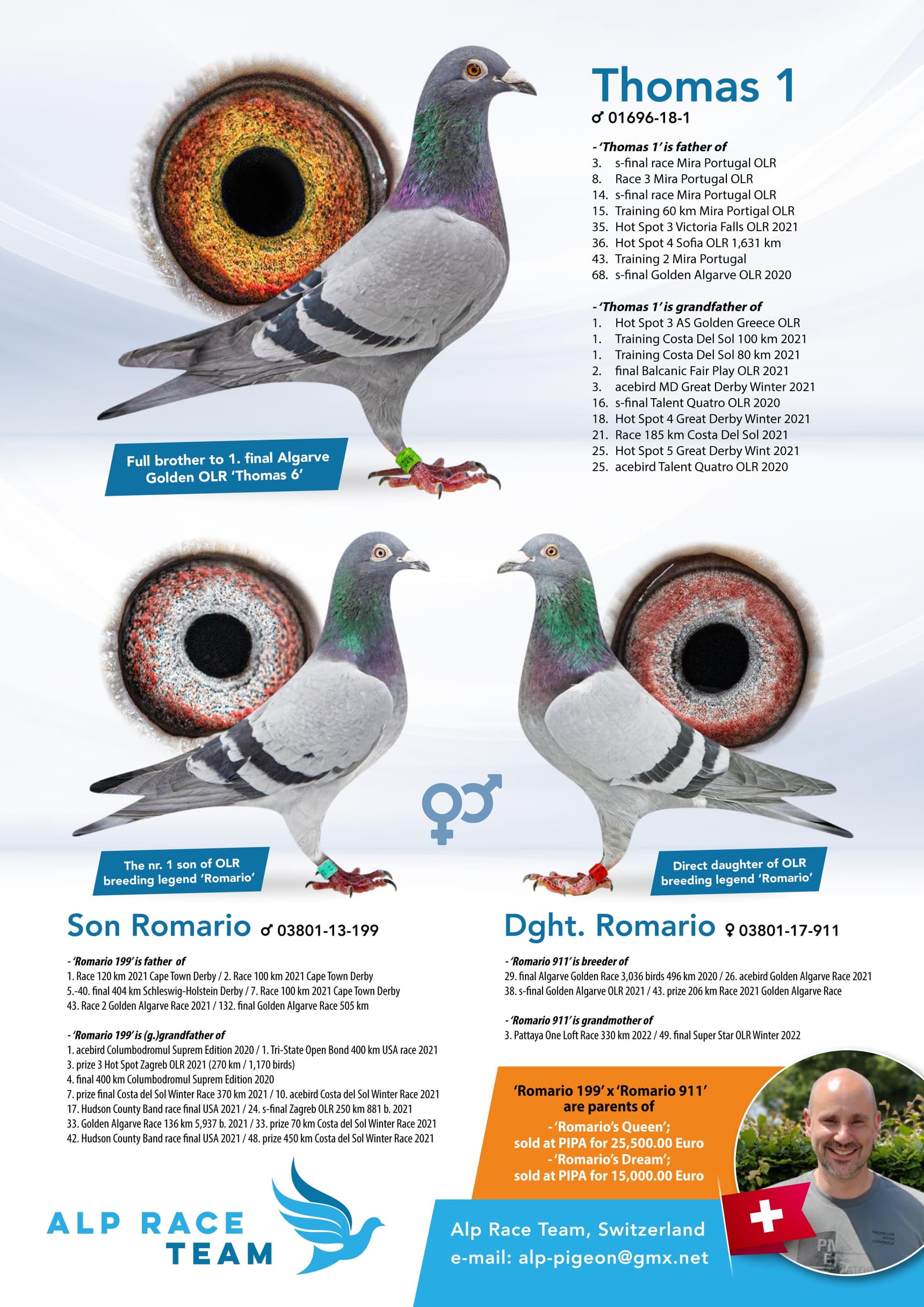 全平辈世界铭鸽“托马斯 6”荣获: 2018年黄金阿尔加夫赛1名 (24分钟领先) - 鸽王8 位 (大约 5,000 羽鸽)