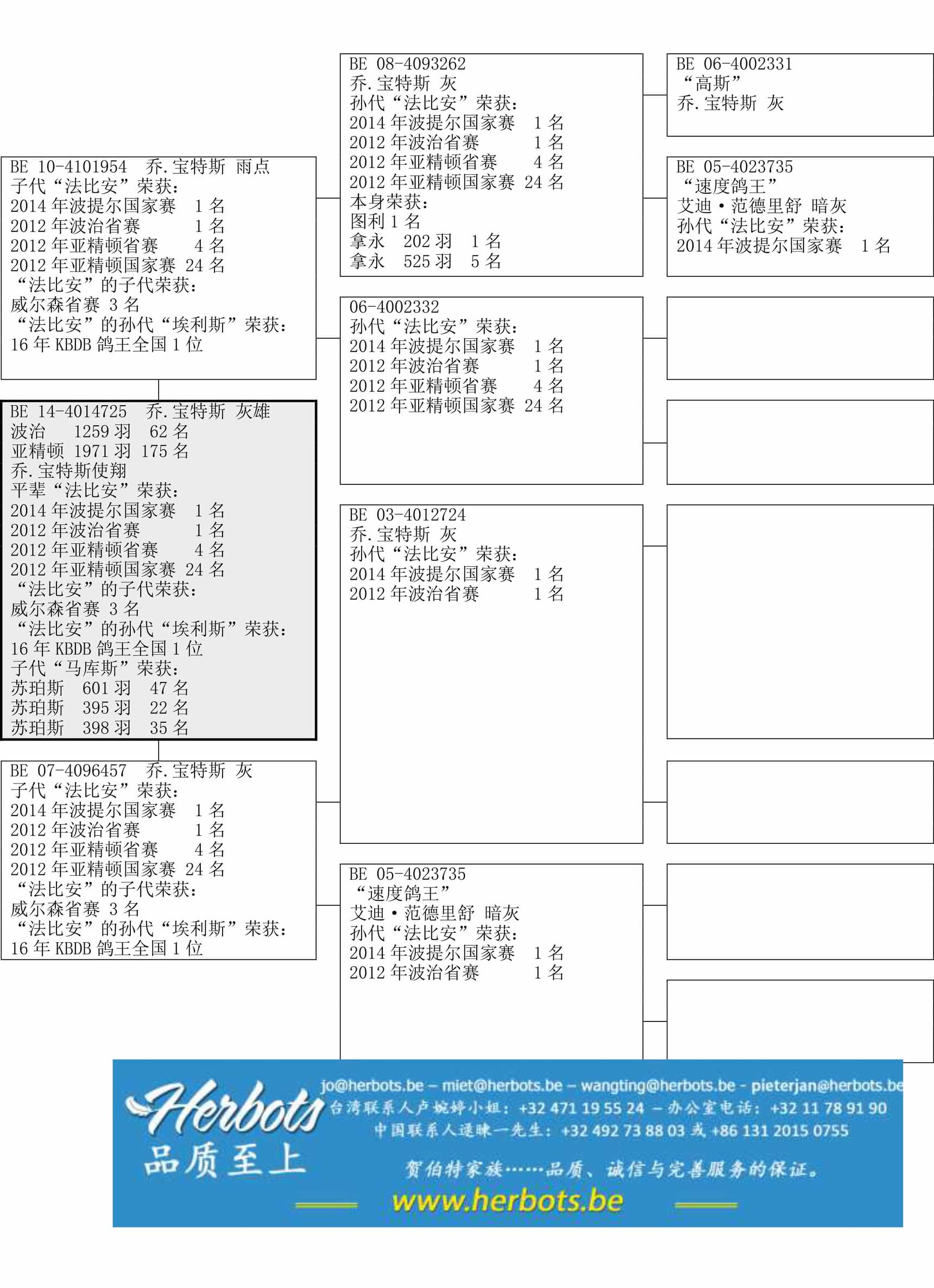 荣获:波治省赛 1,229羽 62名图勒国家赛 6,101羽 279名亚精顿国家赛 9,228羽 447名子代“马库斯”荣获:苏珀斯 395羽22名 – 苏珀斯 398羽35名 – 苏珀斯 601羽47名全平辈“法比安”荣获:波提尔国家赛12,379羽1名冠军种鸽“普特”之全兄弟