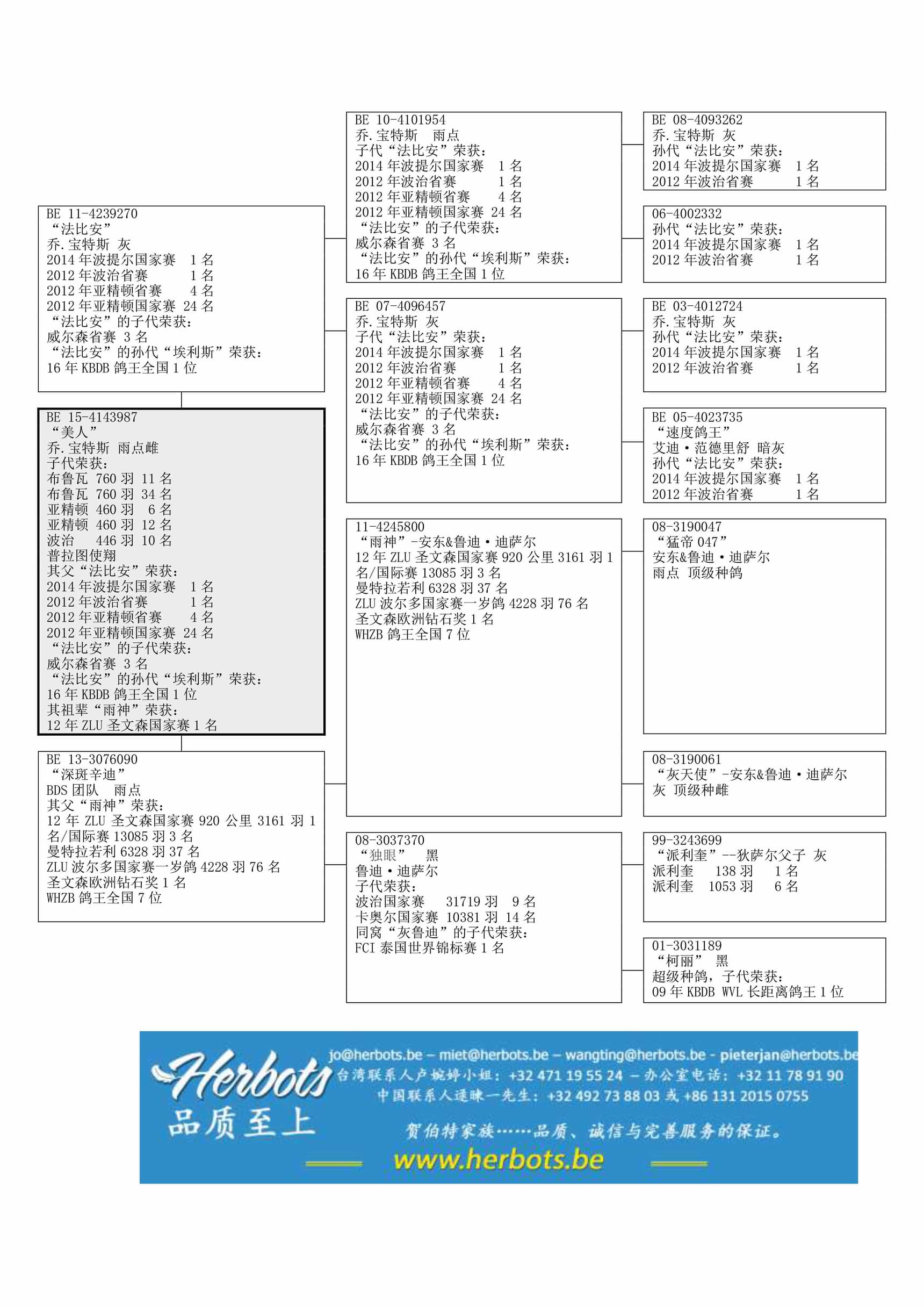 子代荣获:(普拉图K.使翔): 亚精顿 460羽6名 - 波治 446羽10名 - 布鲁瓦 760羽11名 – 亚精顿 460羽12名 - 布鲁瓦 760羽 34名 其父“法比安”荣获:波提尔国家赛 12,379羽1名其祖辈“雨神”荣获:圣文森国家赛1名 - 圣文森国际赛 13,085羽3名
