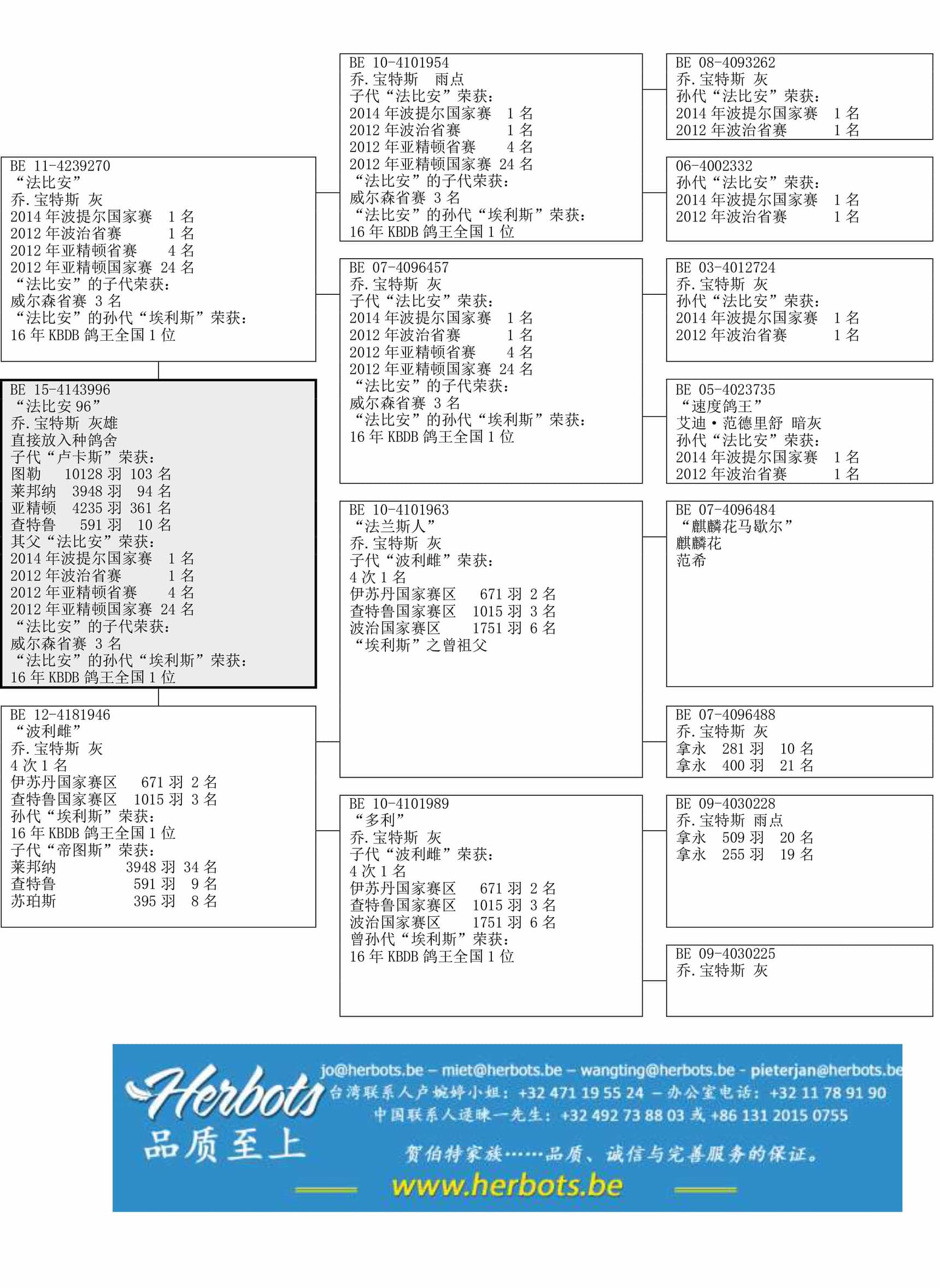 子代“卢卡斯”荣获:查特鲁 591羽10名 - 莱邦纳 3,948羽94名 – 图勒国家赛 10,128羽103名– 亚精顿4,235羽361名其父“法比安”荣获:波提尔国家赛 12,379羽1名基础种雌 “波利雌” ( 4 次1名;孙代“埃利斯”荣获:KBDB鸽王全国1位 ) 直子