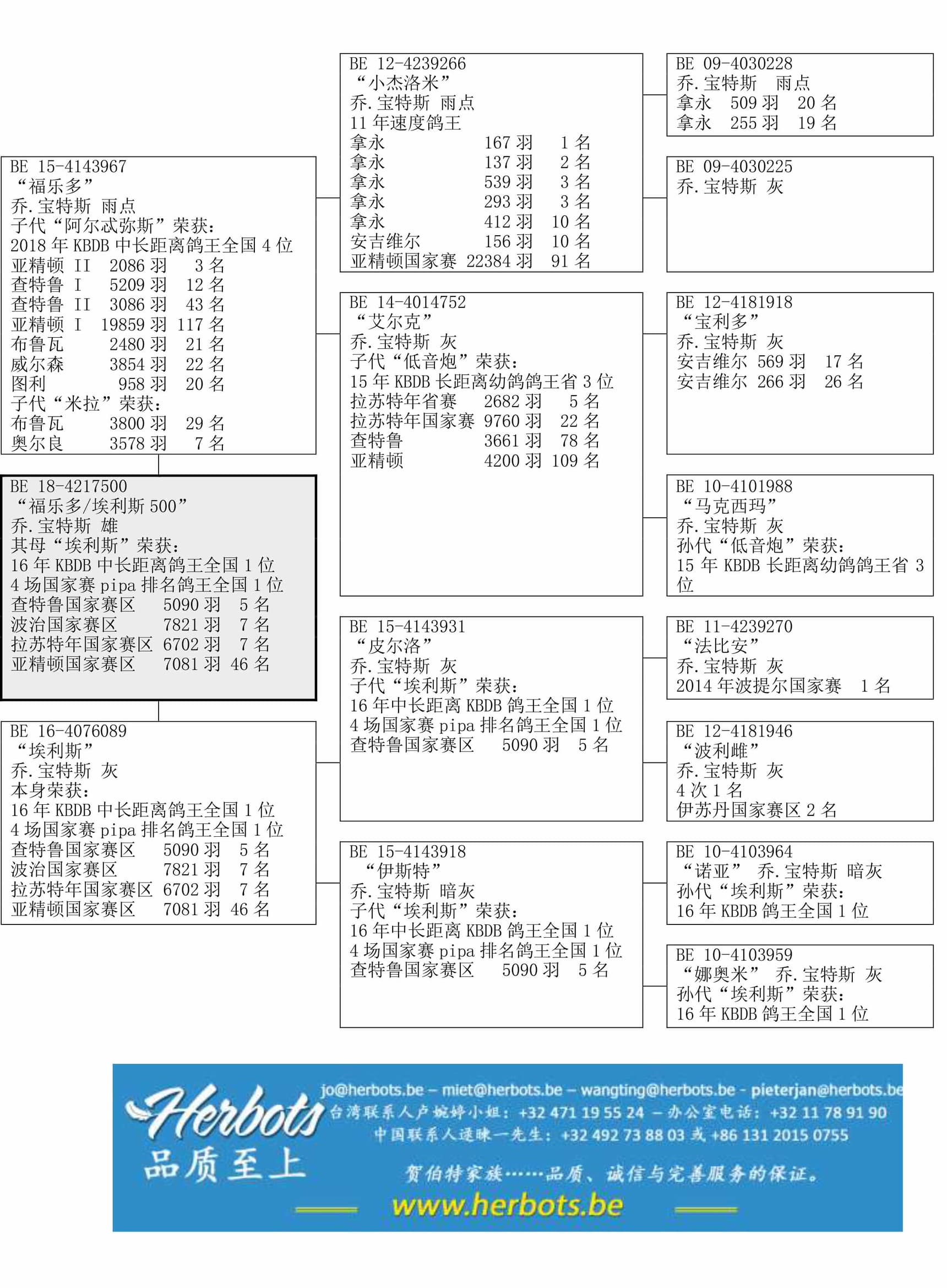 其母“埃利斯”荣获:2016年KBDB中长距离鸽王全国1位 - 查特鲁国家赛区 5,090羽5名 – 波治国家赛区 7,821羽7名 - 拉苏特年国家赛区 6,702羽7名 – 亚精顿国家赛区 7,081羽46名半平辈“阿尔忒弥斯”荣获:2018年KBDB中长距离鸽王全国4位半平辈“米拉”荣获:奥尔良 3,578羽7名 – 布鲁瓦3,800羽29名