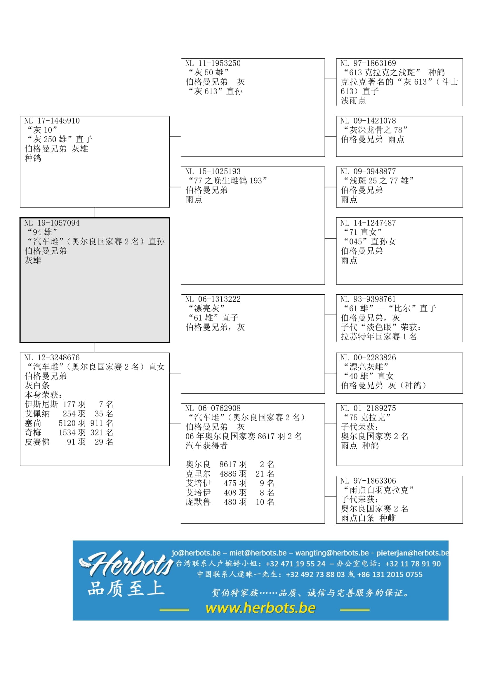 其父“汽车鸽 ”荣获: 奥尔良国家赛 8,617羽2名 – 艾培伊 408羽8名 – 艾培伊 475羽9名 - 庞默鲁 480羽10名 – 克里尔 4,886羽21名