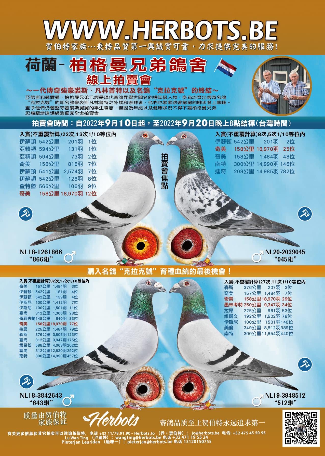 重要消息:伯格曼兄弟只会保留一些鸽子家飞。伯格曼兄弟对贺伯特家族作出了保证永远不会卖那些鸽子。本场拍卖会是最后一次机会从伯格曼兄弟直接买到信鸽!